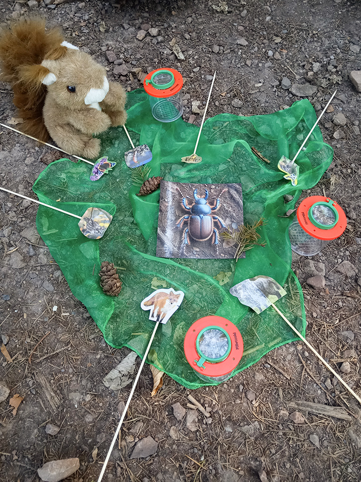 Besonders spannend war das Kochen über dem Feuer. Aus Waldbeeren haben wir eine leckere Waldbeerenmarmelade zuzubereiten. Auch die Bäume standen im Mittelpunkt. Es wurde gesammelt, was sie uns alles schenken, ein buntes Naturmandala gelegt und sich bei einem Spiel selbst in einen Baum verwandelt. Manche Kinder wurden dabei zu einem Nadelbaum, andere zu einem Laubbaum. Beim kreativen Bauen entstand aus Ästen und Laub ein richtiges Waldsofa. Die Kinder haben richtig fleißig mitgeholfen und großartige Äste dafür gefunden. Zum Abschluss der Woche sind wir mit den Becherlupen auf Entdeckungsreise gegangen und haben viele kleine Waldbewohner aus nächster Nähe beobachtet - das war spannend.