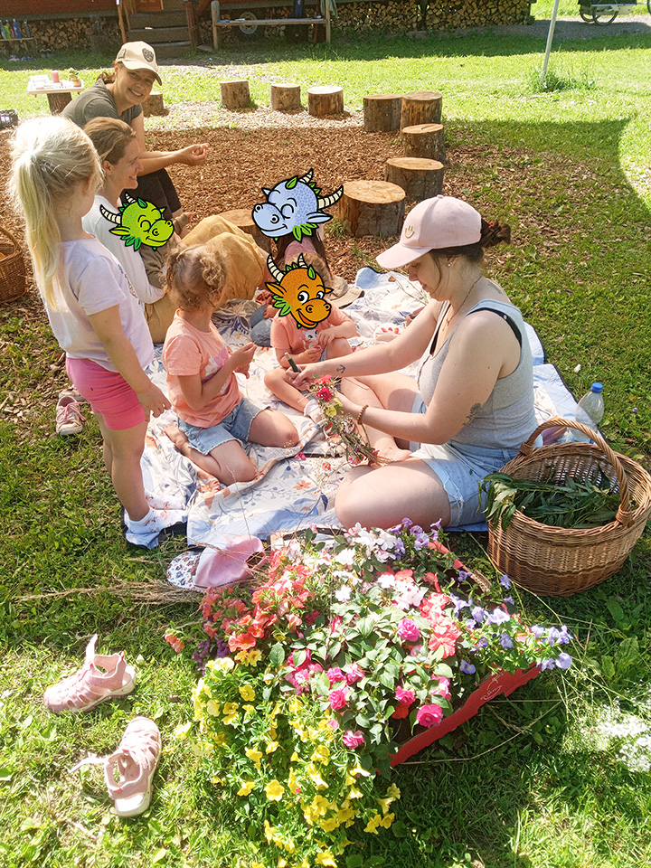 Am Freitag war es dann soweit. Mit einer Geschichte von Pettersson und Findus starteten wir im Morgenkreis in unser Fest. Auch ein kleines Feuer haben wir angezündet – denn das gehört einfach dazu. Zum Frühstück gab es dann Waffeln mit frischen Erdbeeren uns selbstgemachte Holunderlimonade. Der ganze Tag wurde mit fröhlicher Musik untermalt und auch das Tanzen kam nicht zu kurz.