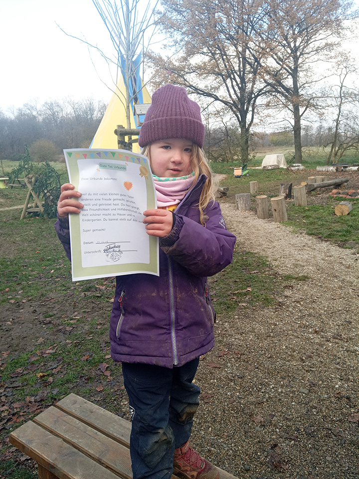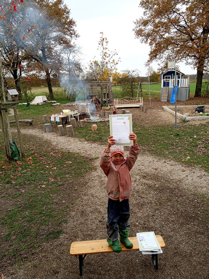 In dieser Zeit erlebten die Kinder, wie schön es ist, miteinander kreativ zu sein, Ideen zu teilen und eigene Lösungen zu finden. Sie lernten, Materialien aus der Natur sinnvoll zu nutzen, sorgsam mit ihrer Umgebung umzugehen und mit Geduld etwas entstehen zu lassen, das Bestand hat. Als Dank für all die Mühe hing eines Morgens ein neuer Brief am großen Briefkasten- von Flutschiknutsch höchstpersönlich!