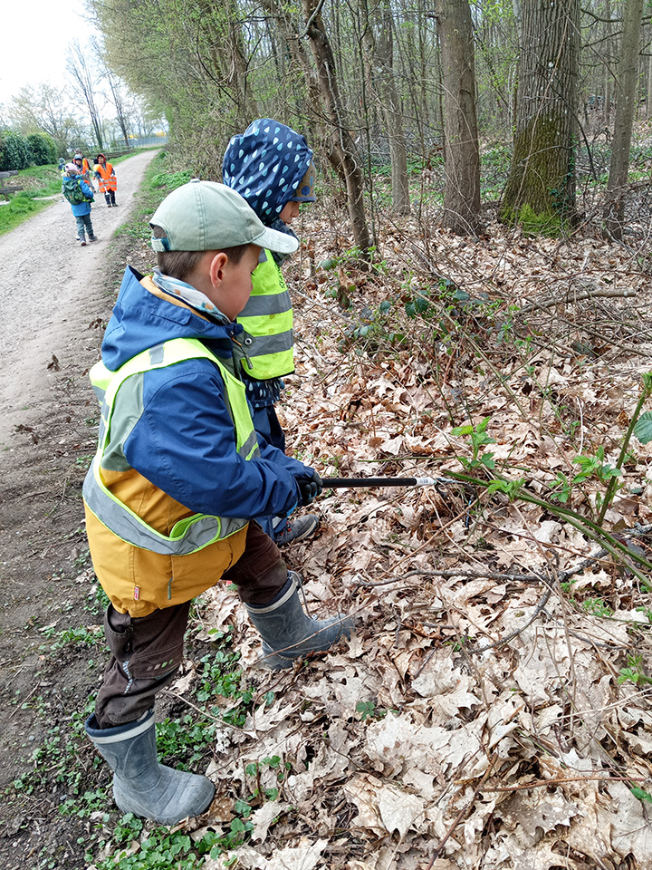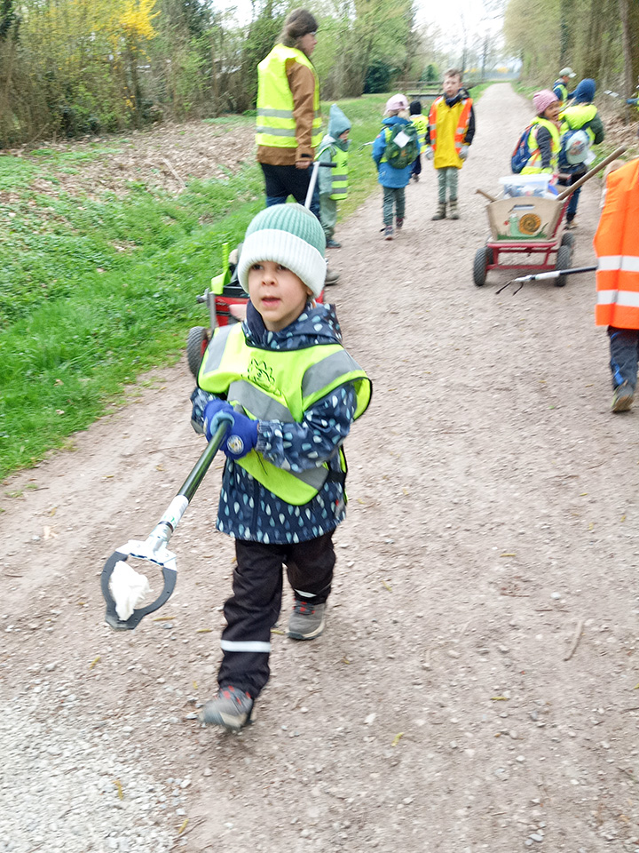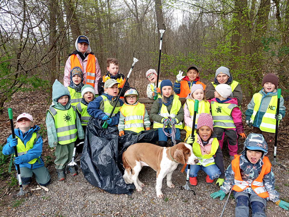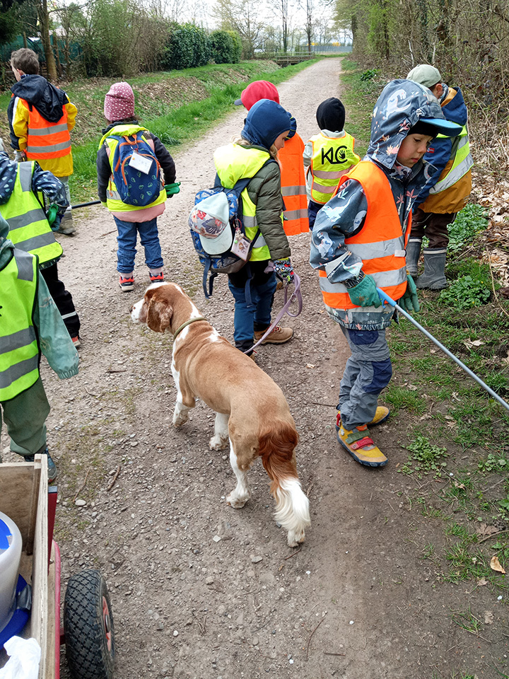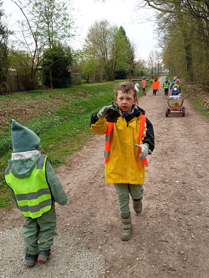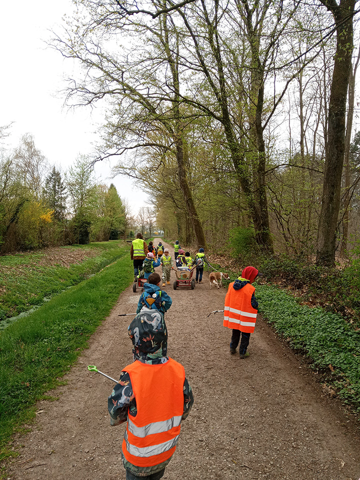 Entlang des Waldrandes ging es Schritt für Schritt voran. Aufmerksam durchkämmten die Kinder Büsche, Wege und Wiesen und entdeckten dabei so manche Überraschung. Mit wachem Blick und großem Eifer sammelten sie achtlos weggeworfenen Müll ein und halfen so, die Natur ein Stück sauberer zu machen.