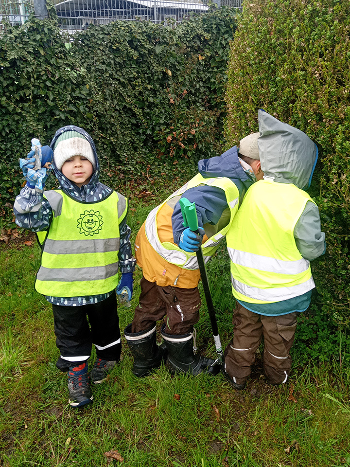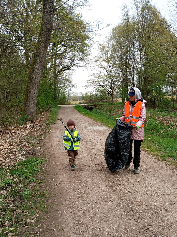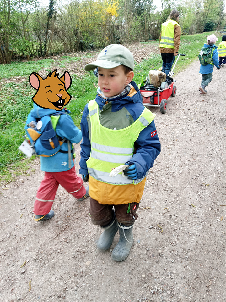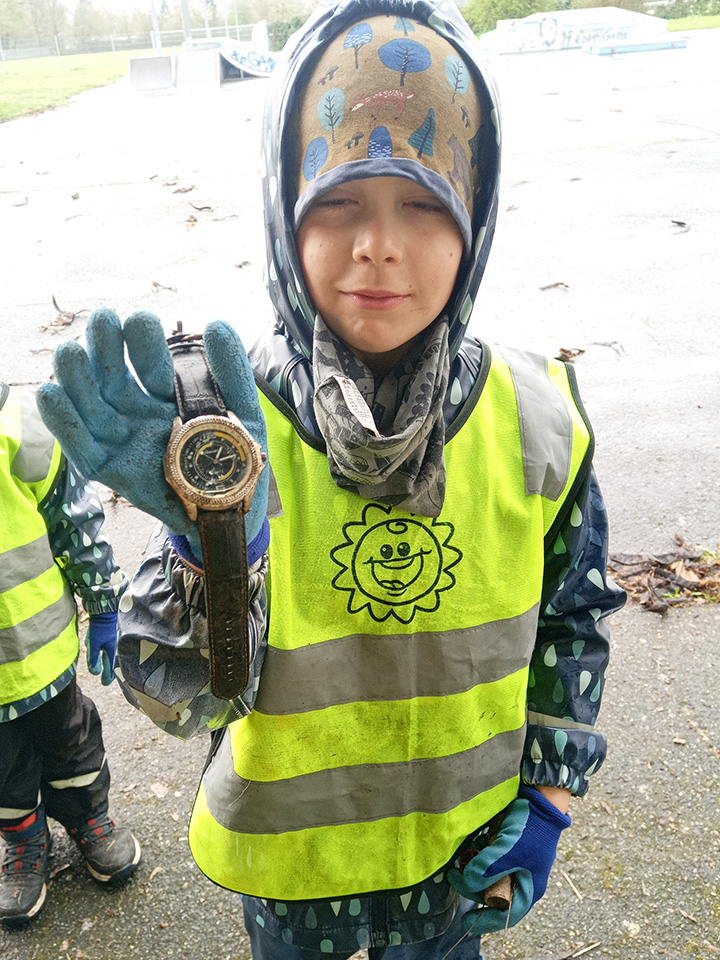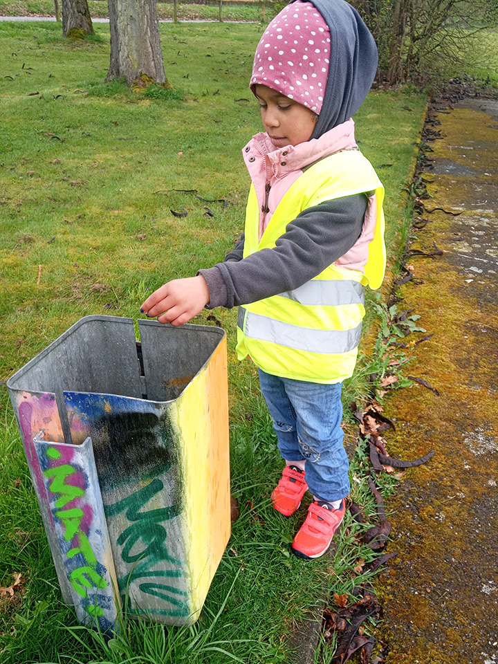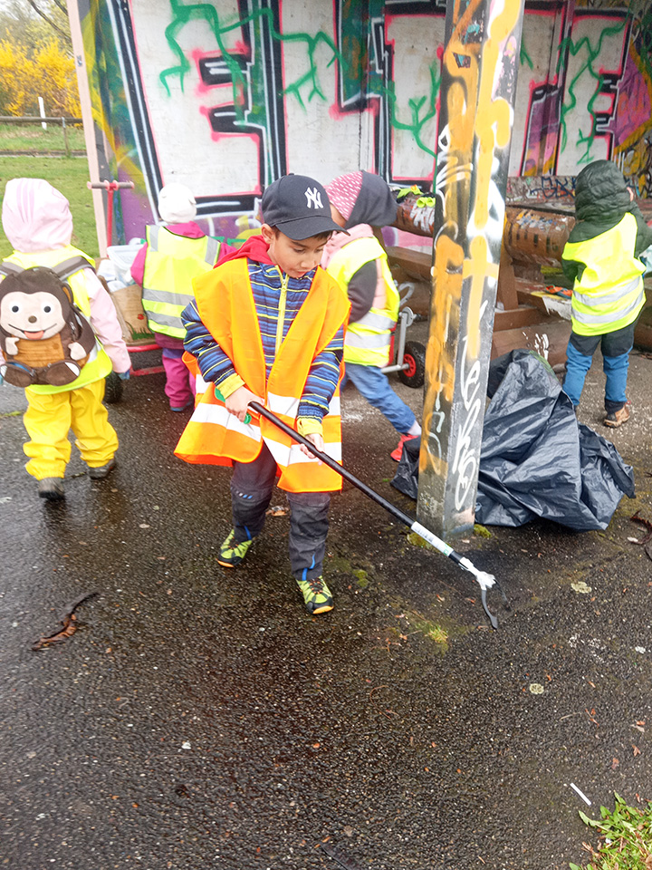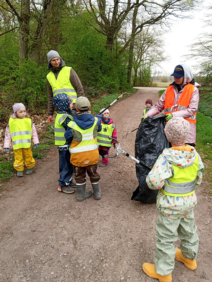 Entlang des Waldrandes ging es Schritt für Schritt voran. Aufmerksam durchkämmten die Kinder Büsche, Wege und Wiesen und entdeckten dabei so manche Überraschung. Mit wachem Blick und großem Eifer sammelten sie achtlos weggeworfenen Müll ein und halfen so, die Natur ein Stück sauberer zu machen.
