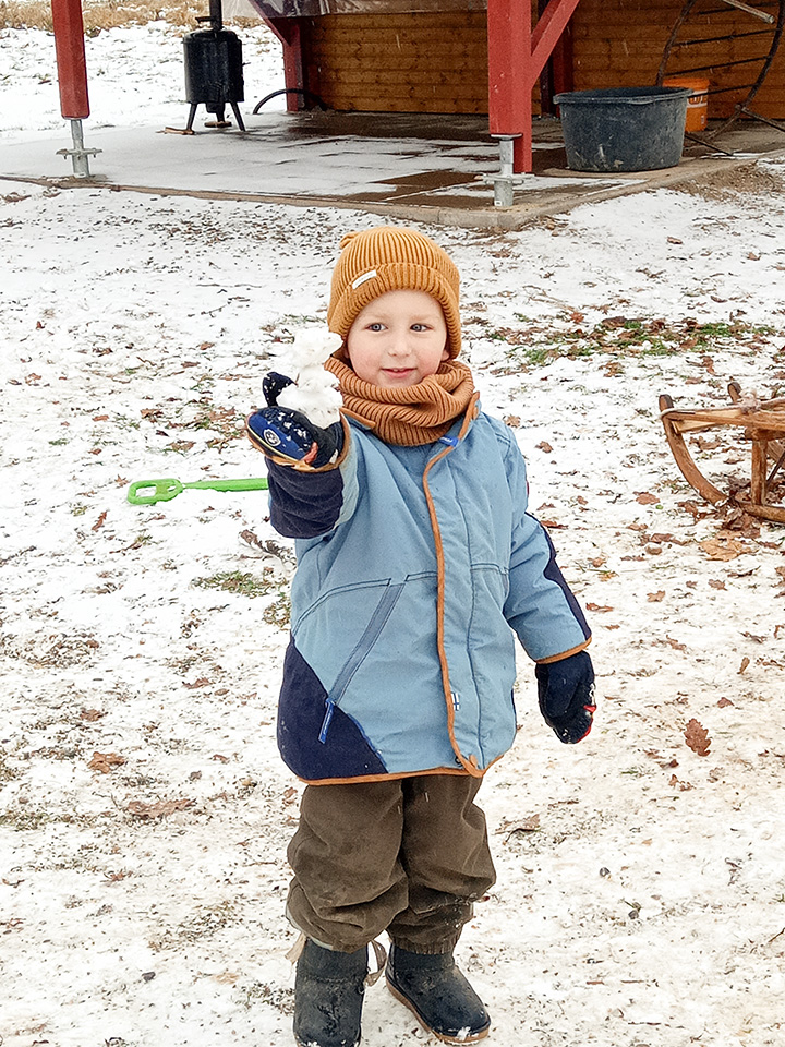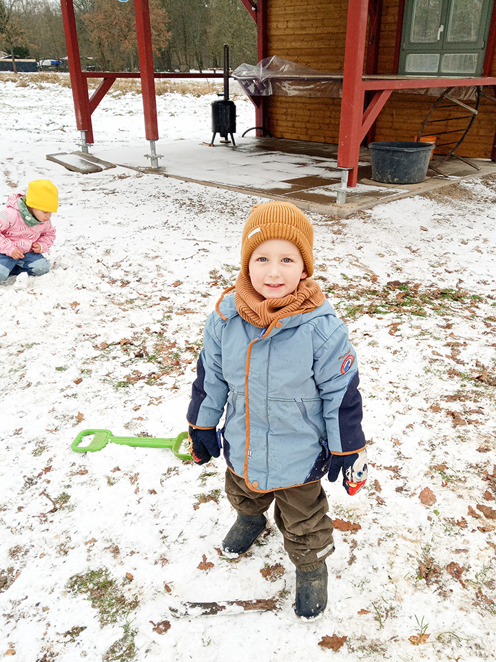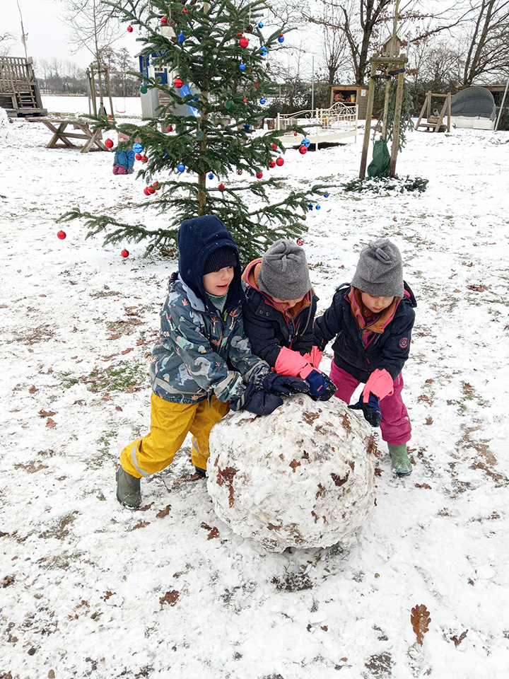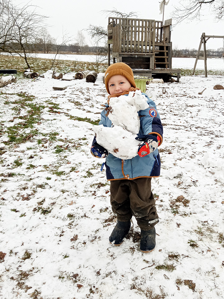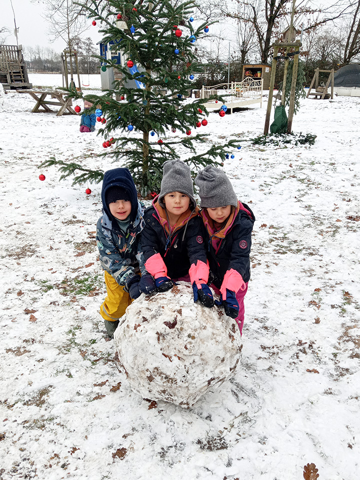 Über Nacht hat der Himmel eine weiße Decke aus Schnee gezaubert. Als wir morgens in den Kindergarten kamen, lagen die Flocken noch weich auf dem Boden – und die Aufregung der Kinder war riesengroß. Draußen wurde sofort gespielt: Es entstanden große und kleine Schneebälle und ein erster Schneemann, der bald zum König unseres Hofes wurde.