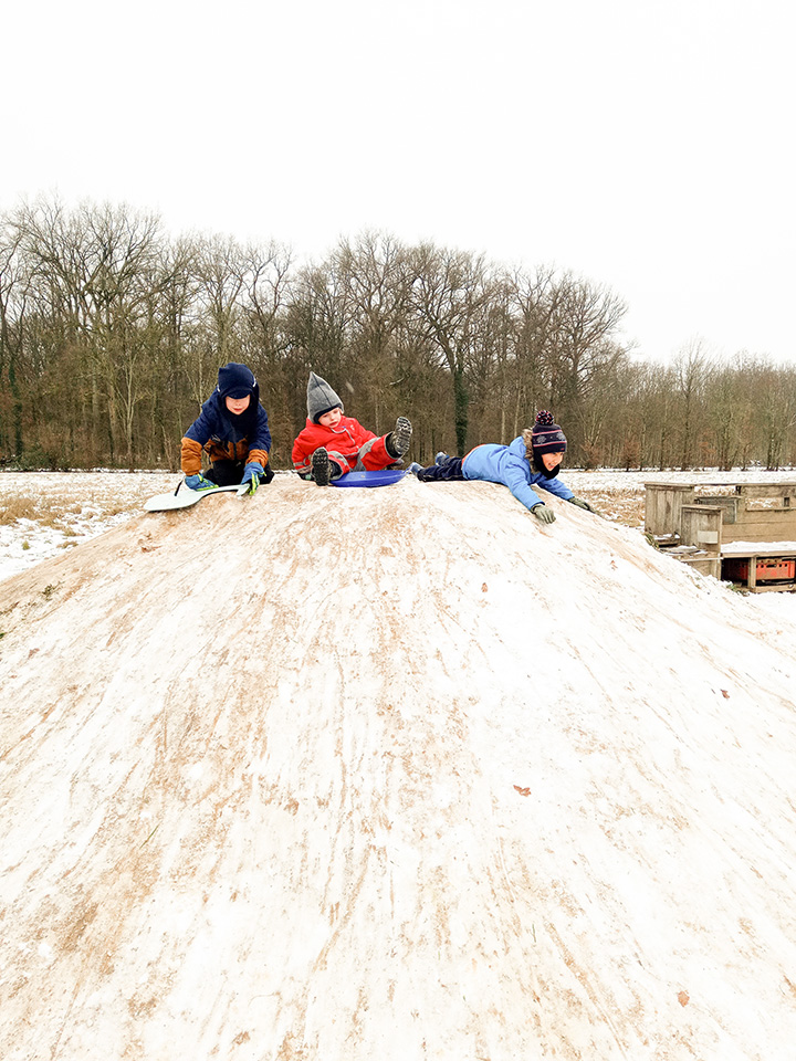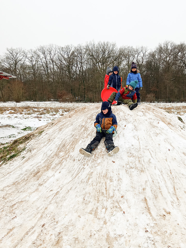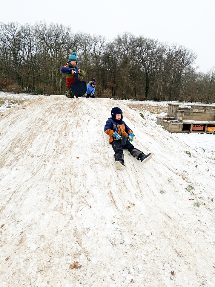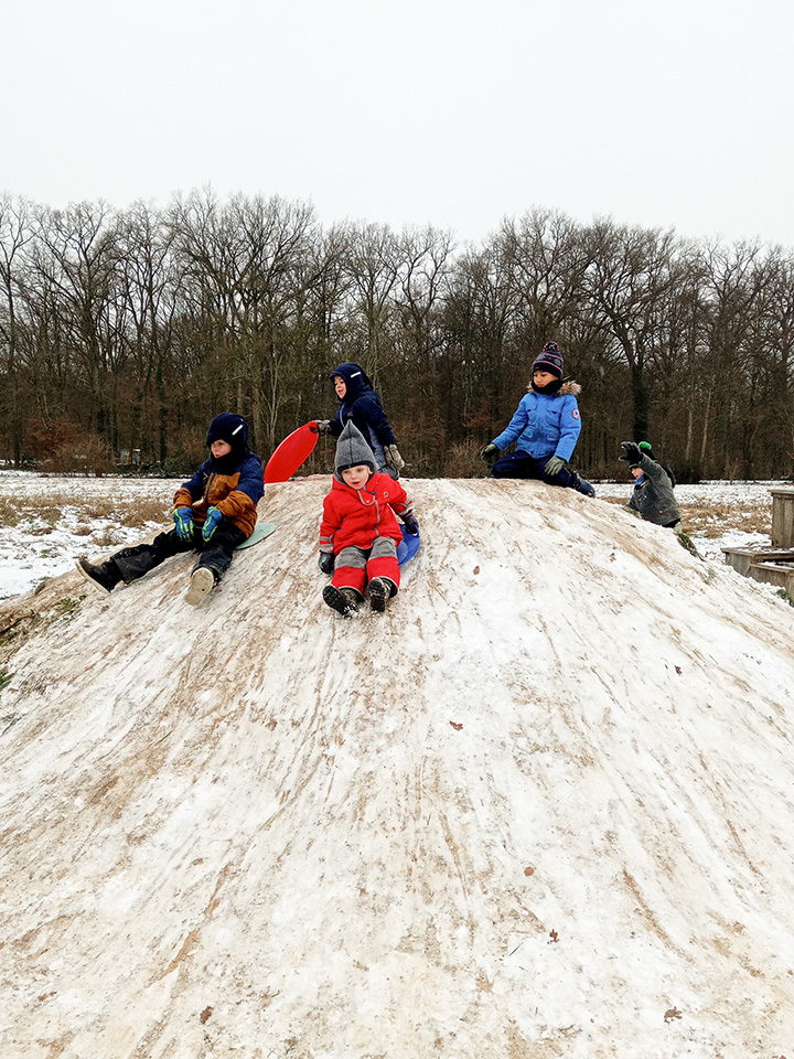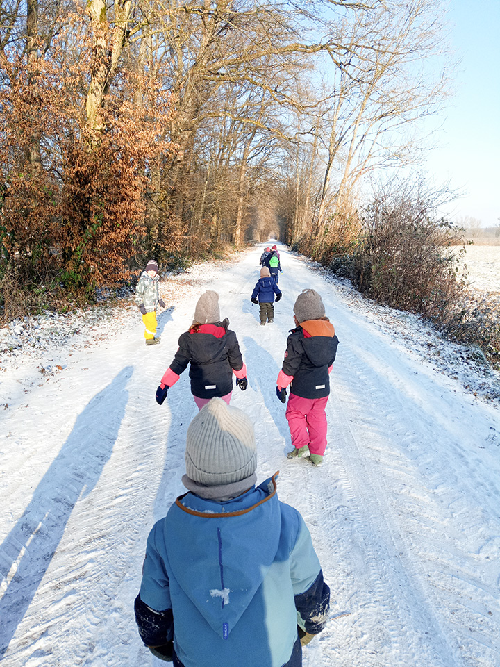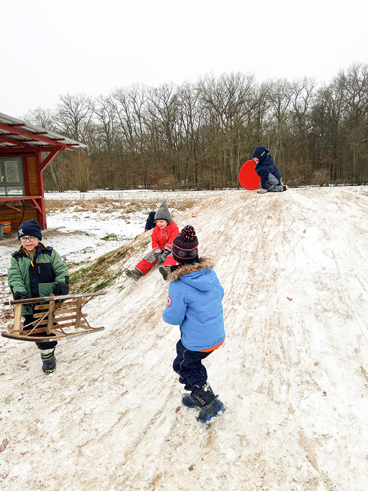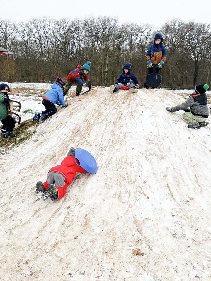 Zurück im Kindergarten wurde gerutscht, gelacht und gespielt. Unser Hügel verwandelte sich in eine Rutschbahn, auf der die Kinder mit viel Freude hinuntersausten. Zwischendurch genossen wir die klare Winterluft und die besondere Stimmung dieses Tages. Leider war der Schnee nur von kurzer Dauer – doch die Erinnerungen bleiben.