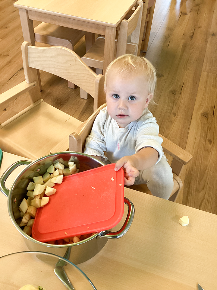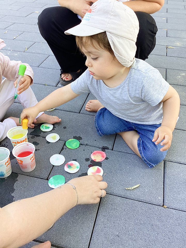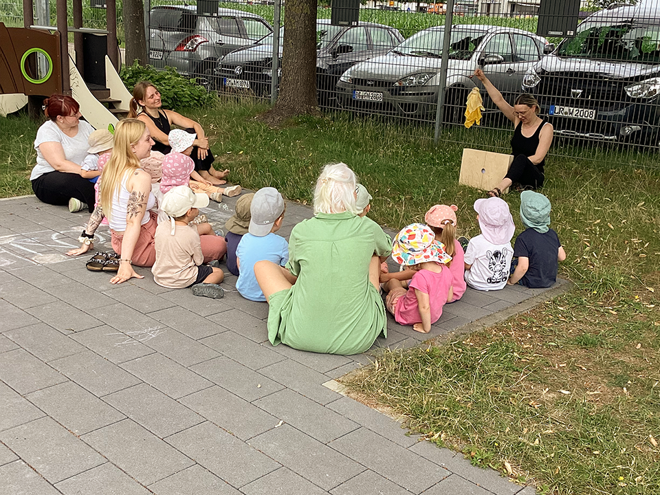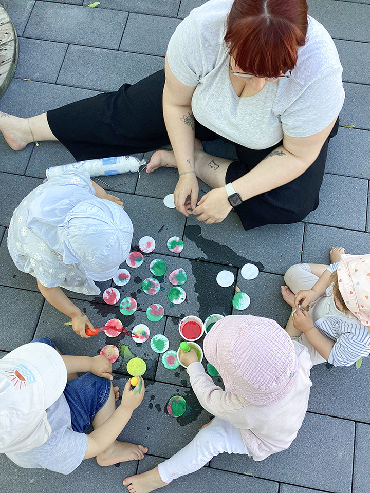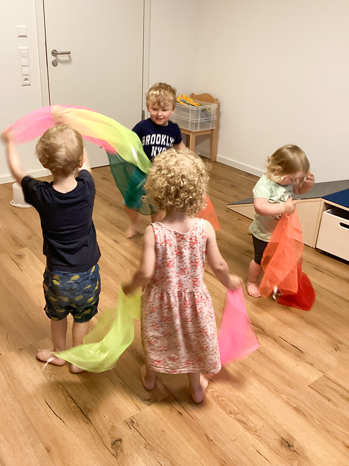 Durch kreative Angebote wie Korkendruck am Fenster, Farbexperimente mit Pipetten auf Wattepads und Fingerspiele erlebten wir den Entwicklungsprozess hautnah. Dabei lernten wir auch Gebärden für „Raupe“ und „Schmetterling“ – und konnten uns in Bewegungs- und Musizierangeboten wie richtige kleine Schmetterlinge fühlen. Besonders begeistert waren wir vom Spiel „Schmetterling, du kleines Ding“ – mit selbstgebastelten, bunten Flügeln wurde es lebendig!