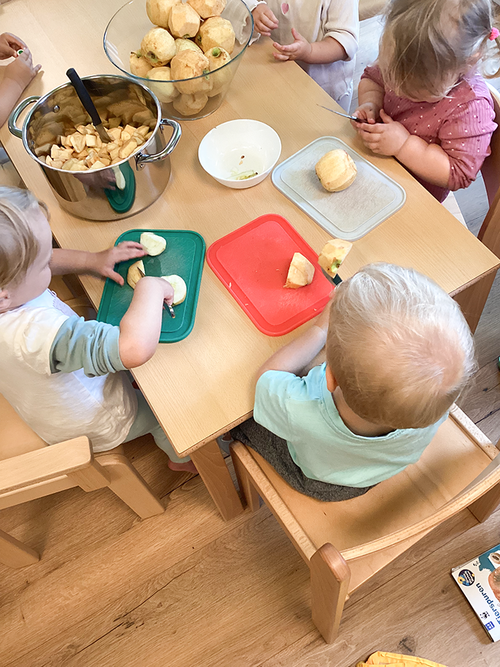 Im März kam die Mutter Erde zu uns, diese fegte den König Winter weg und sorgte für den Frühling, welcher Blumen erblühen ließ. Das wurde durch unsere Figuren und einer Kamishibai-Geschichte gezeigt. Dazu malten wir Fensterbilder und bepflanzten unser Außengelände. Durch das schöne Wetter waren wir viel in der Sonne unterwegs, gingen Spazieren oder verbrachten Zeit im Hof, wie im Sandkasten.