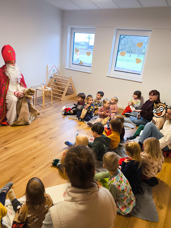 Der König Winter zog bei uns ein – begleitet von seinem Freund, dem Wichtel Gustav. Sie brachten zwar Kälte und Nebel mit, aber auch lustige Streiche und Aufgaben für die Kinder. Wir unternahmen viele Spaziergänge: Auf den Sportplatz zur Rasenschnecke, zu verschiedenen Spielplätzen und übten im Hof das Laubspringen.