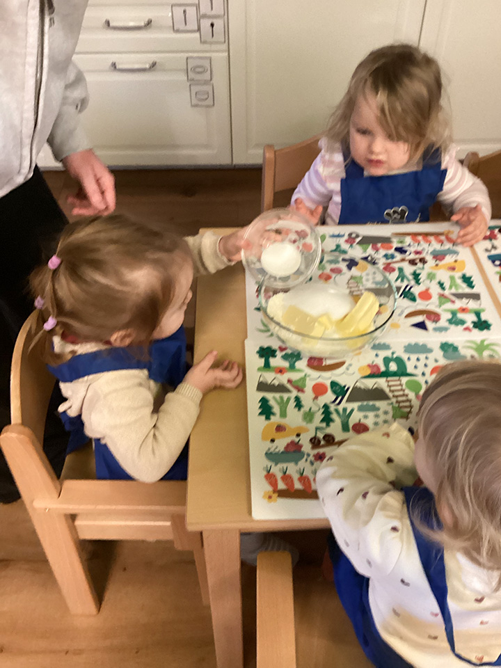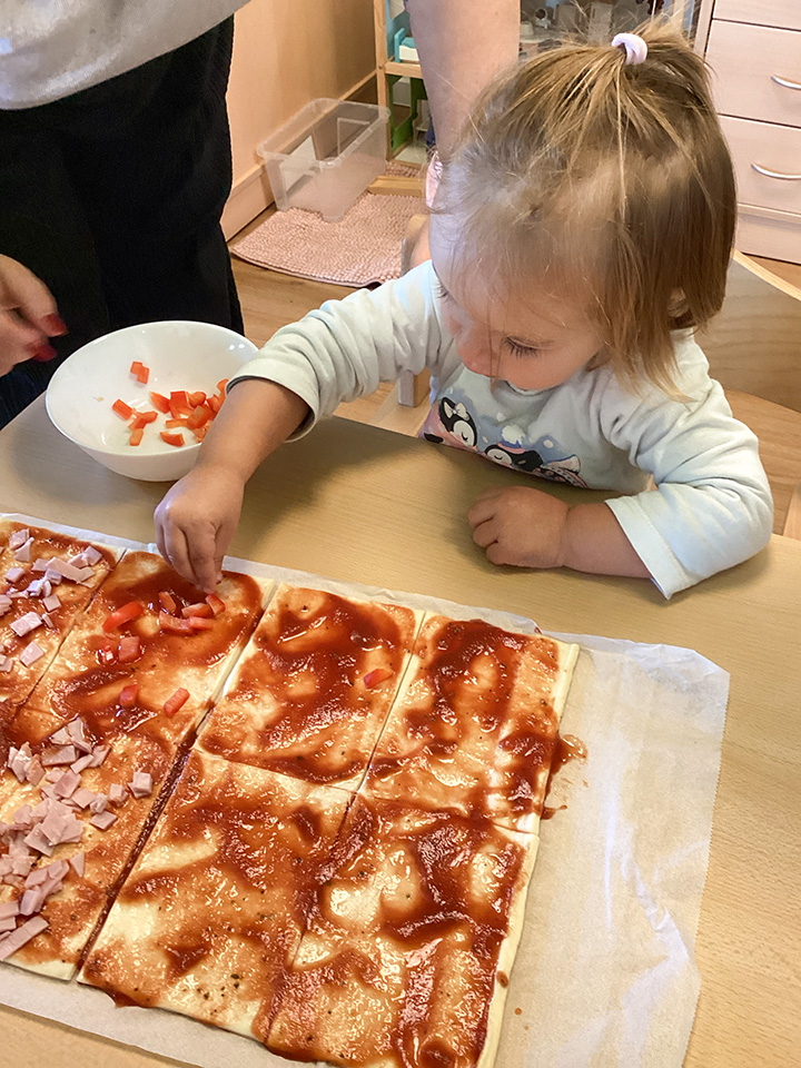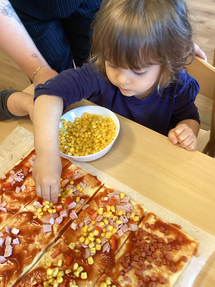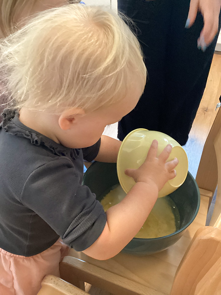 - Malen mit Fingerfarbe, Schneiden, Kochen und Backen – der Umgang mit Lebensmitteln gehörte zu unseren regelmäßigen Sinneserfahrungen.