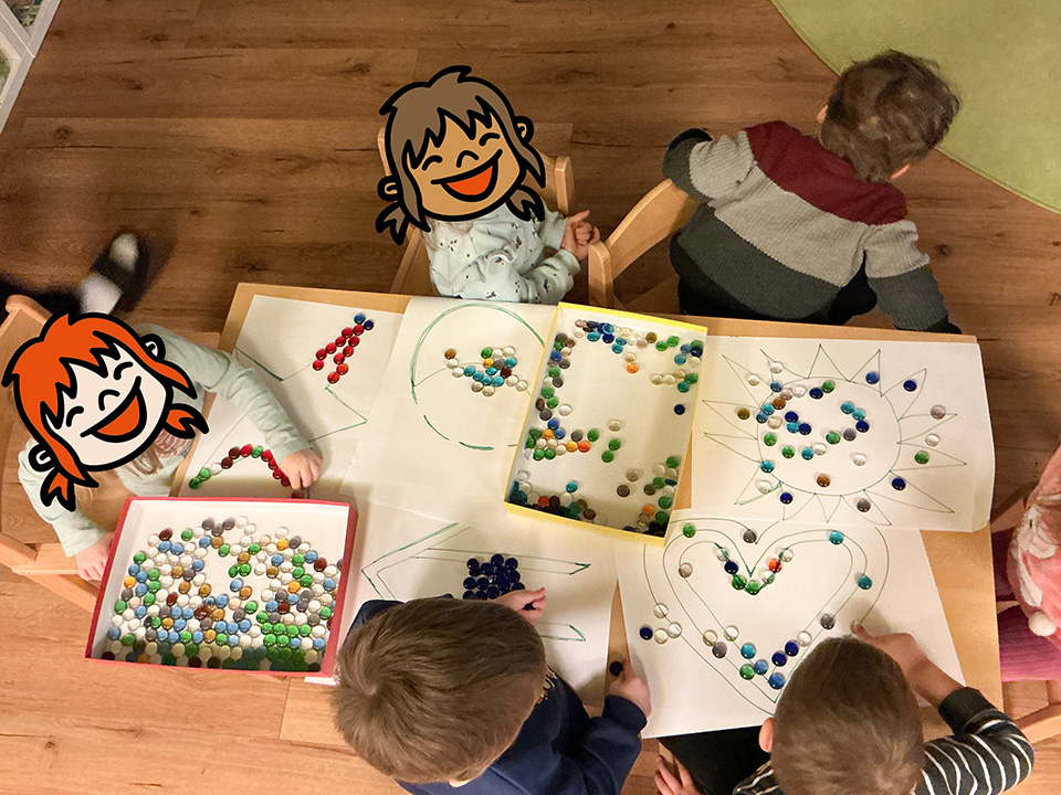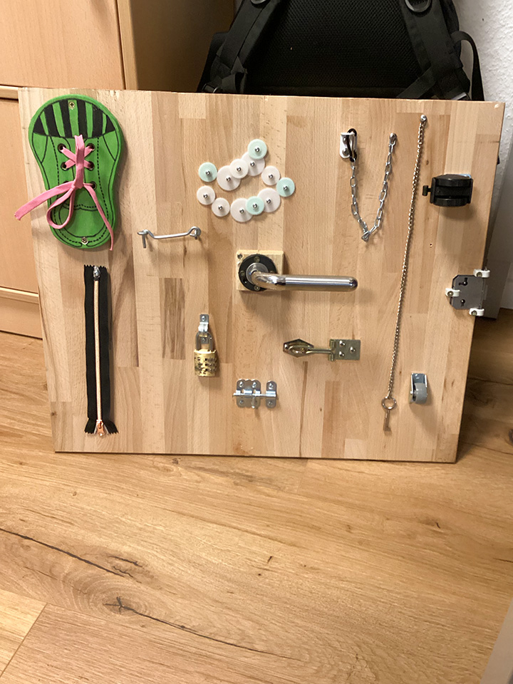Ein selbstgemachtes Sensomotorik-Brett wurde gemeinsam hergestellt, unterstützt von den Eltern. Es wurde auch richtig gruselig bei uns: An Halloween befreiten die Fledermäuse aus der Burg, die von den Schlossdrachen bewacht wurden, und wir feierten ein Halloweenfest mit großem Buffet.