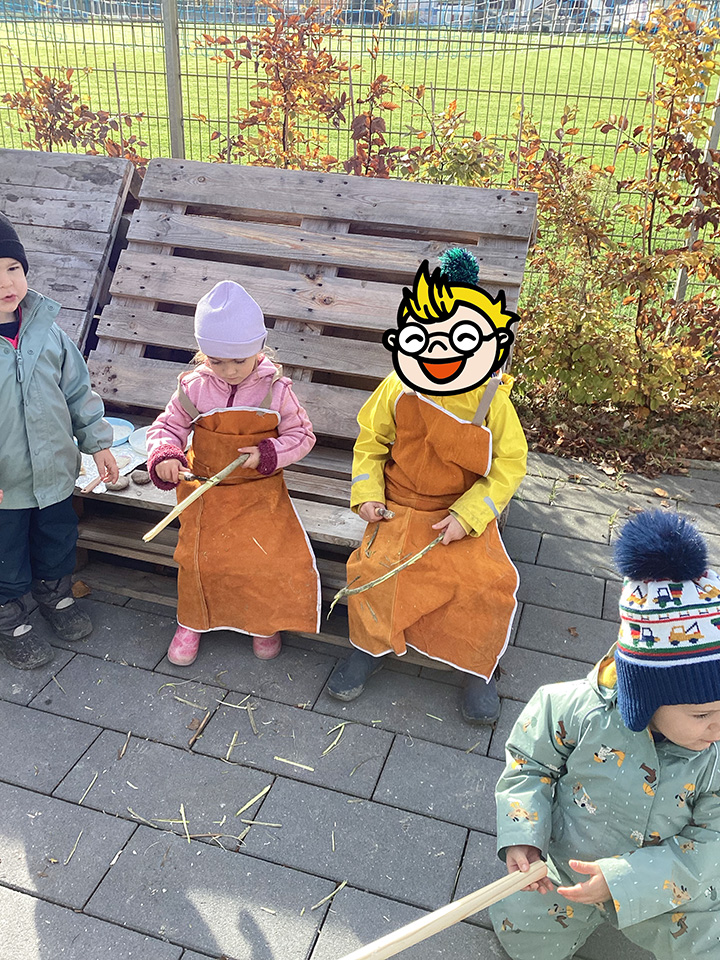 Die Zeit der Ruhe und Lichter ist bei uns angekommen: Laternen basteln. Spiele zum St. Martin/Lichterfest üben, mit Musikinstrumenten, Pferd und Schwert. Stockbrot in der Feuerschale backen und Stöcke schnitzen. Gemeinsam mit den Familien feierten wir so unser St. Martin- und Lichterfest – eine stimmungsvolle Mischung aus Bewegung, Kreativität, Musik und gemeinsamer Zeit.