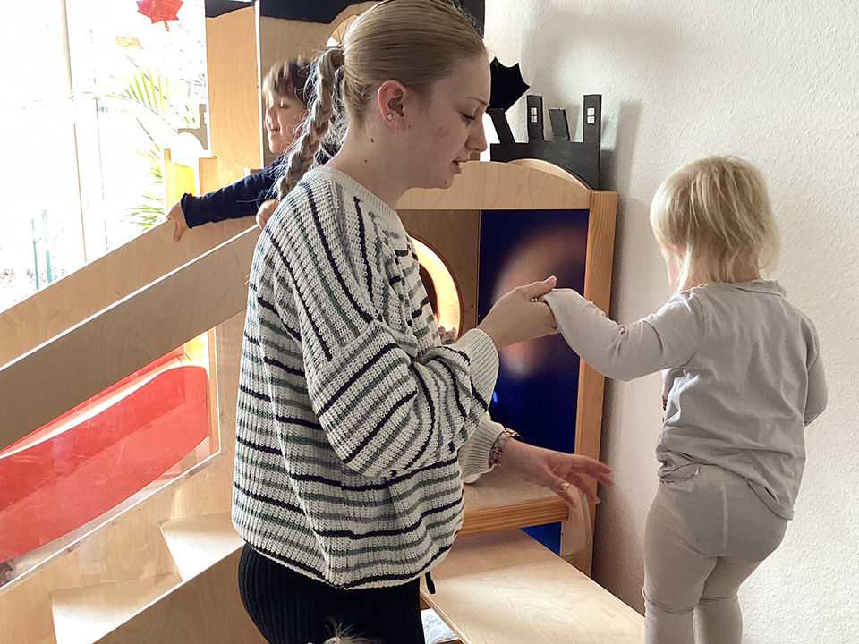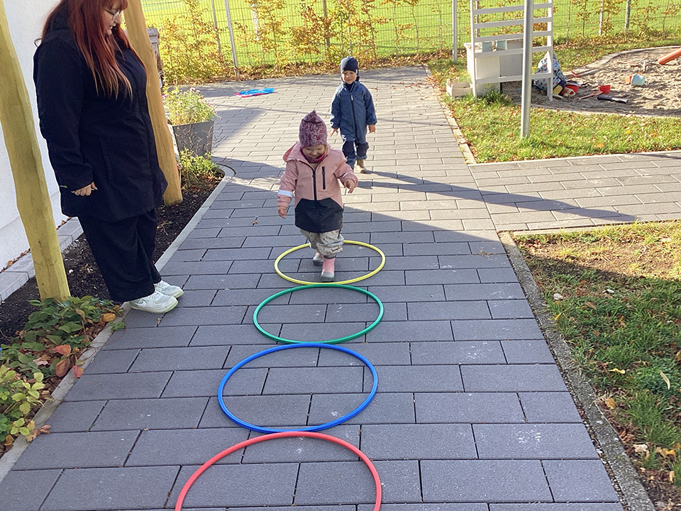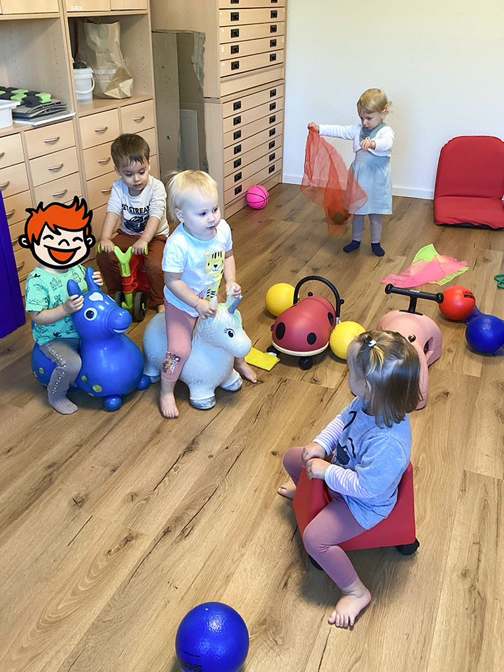 Unsere Schlossstunde wurde ins Leben gerufen: Bewegungsstunden, in denen wir spielerisch Bewegung und Sport entdecken – inspiriert von verschiedenen Tieren. Das Känguru zeigt uns, wie man gut springt. Der Bär liebt Yoga. Der Kletteraffe hangelt sich geschickt hin und her. Viele Tiere und ihre einzelnen Bewegungsabläufe bauen aufeinander auf und fördern die Körperwahrnehmung und Koordination der Kinder. Die Schlossstunden finden in unserem Bewegungsraum, draußen und sogar im alten Feuerwehrhaus statt, wo uns ein größerer Raum zur Verfügung steht.