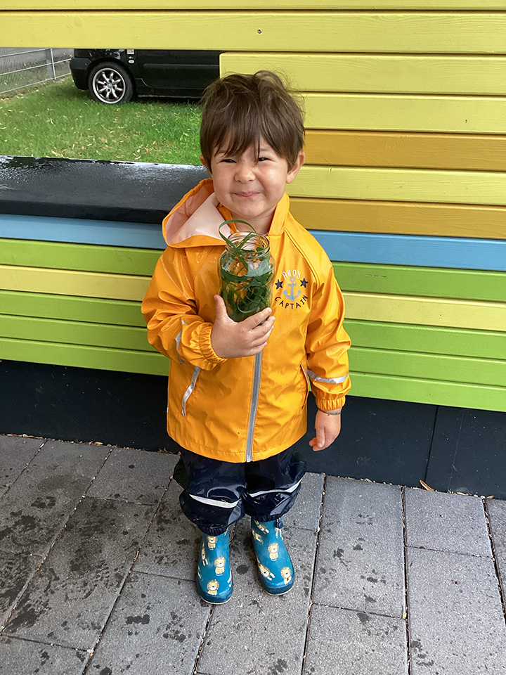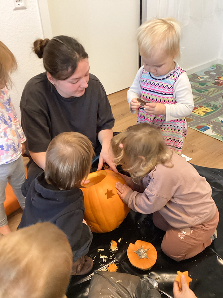 Die Herbstzeit begann und damit auch die Zeit der Kürbisse, Regen und Matsch – die wir draußen ausgiebig genossen haben. Wir sprangen in Pfützen, beobachteten Regenwürmer und Schnecken und tanzten auch bei Regen. Viele kreative Ideen wurden umgesetzt: