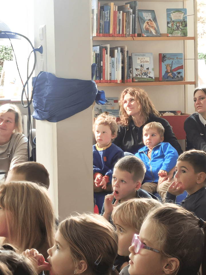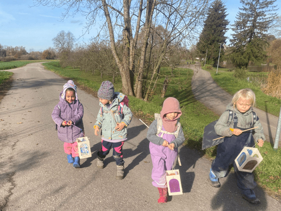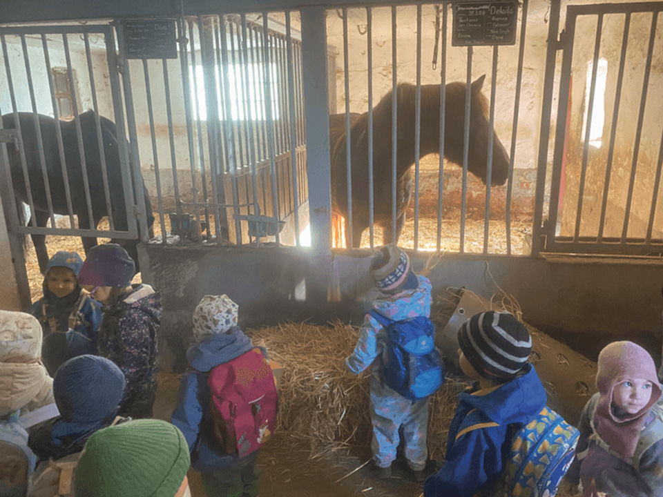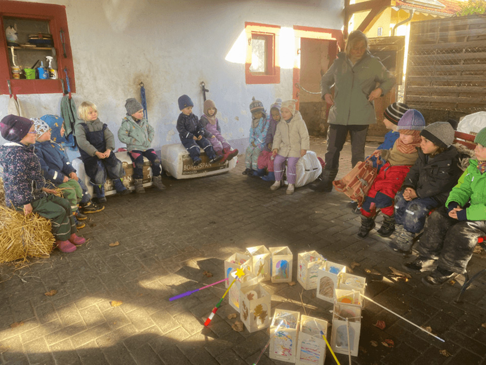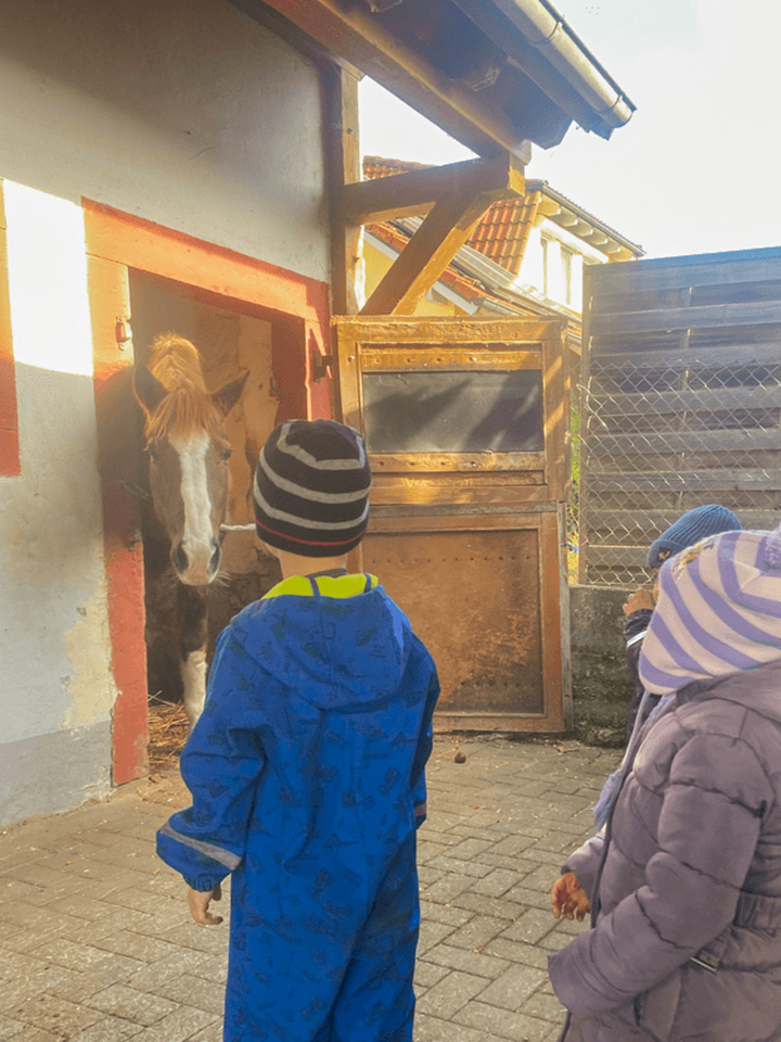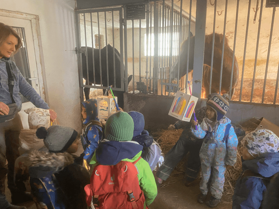 Zu unserem St. Martinsfest hörten wir noch einmal die Geschichte vom heiligen Martin – erzählt mit dem Kamishibai-Erzähltheater. Gebannt lauschten die Kinder der Legende vom Teilen und von der Nächstenliebe. Anschließend machten wir uns mit unseren Laternen und gemeinsamem Gesang auf den Weg zum Pferdestall. Dort brachten wir den Pferden Äpfel und Karotten mit.