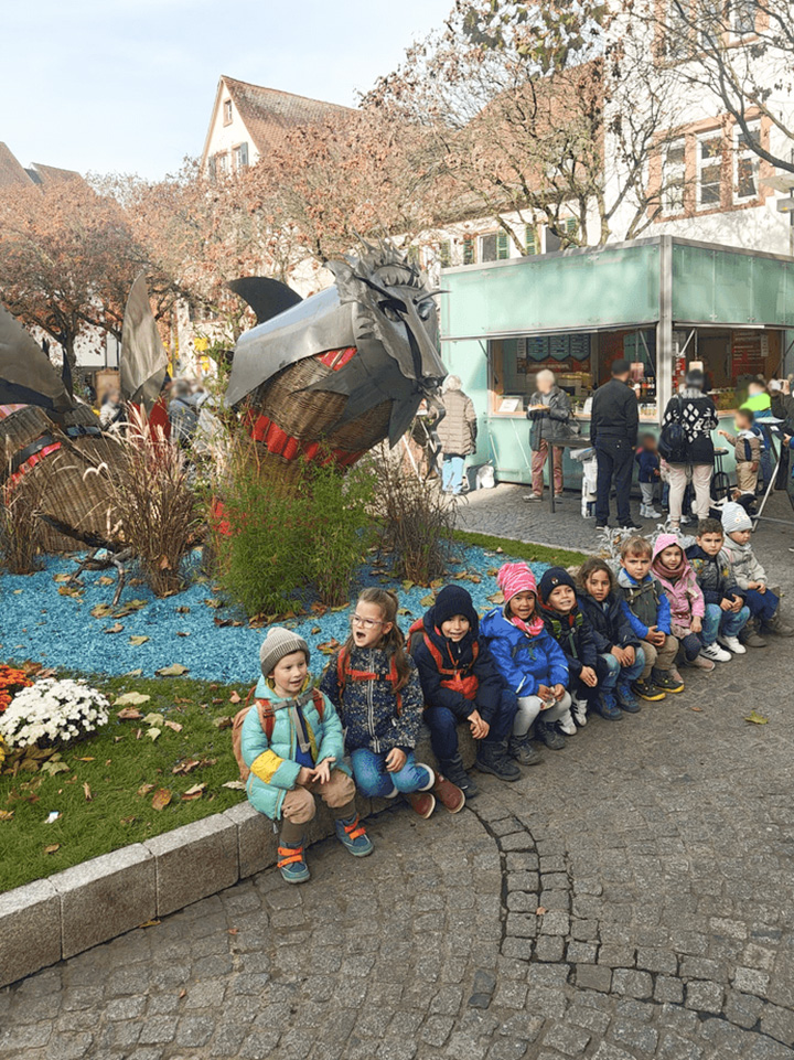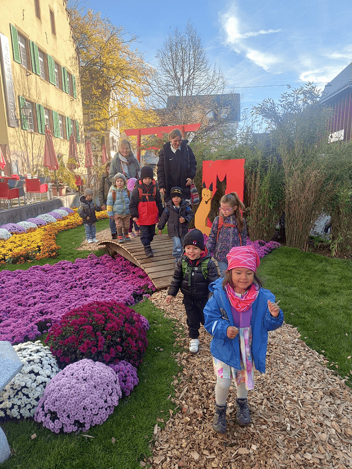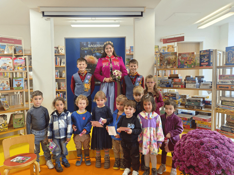 Im Oktober machten wir uns mit dem Bus auf den Weg nach Lahr, um die festlich mit Blumen geschmückte Stadt zur Chrysanthema zu besuchen. In der Bücherei trafen wir die Chrysanthemenkönigin. Sie las uns eine Geschichte vor, und natürlich durfte anschließend ein gemeinsames Foto nicht fehlen.