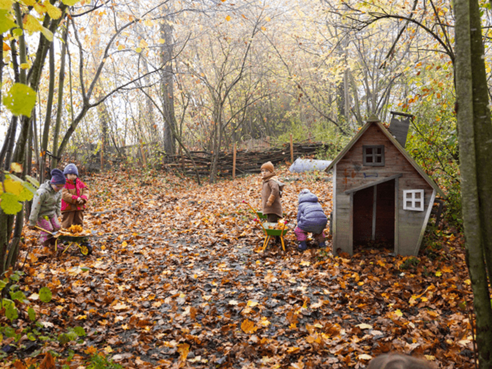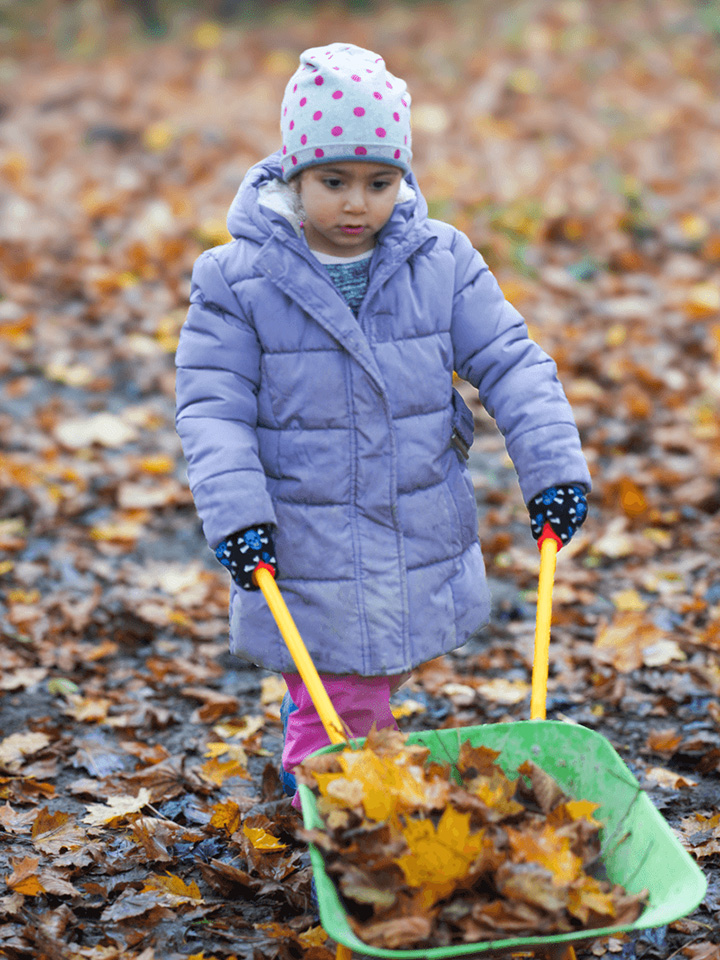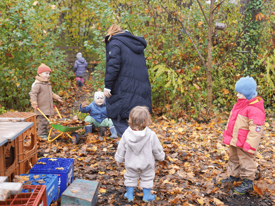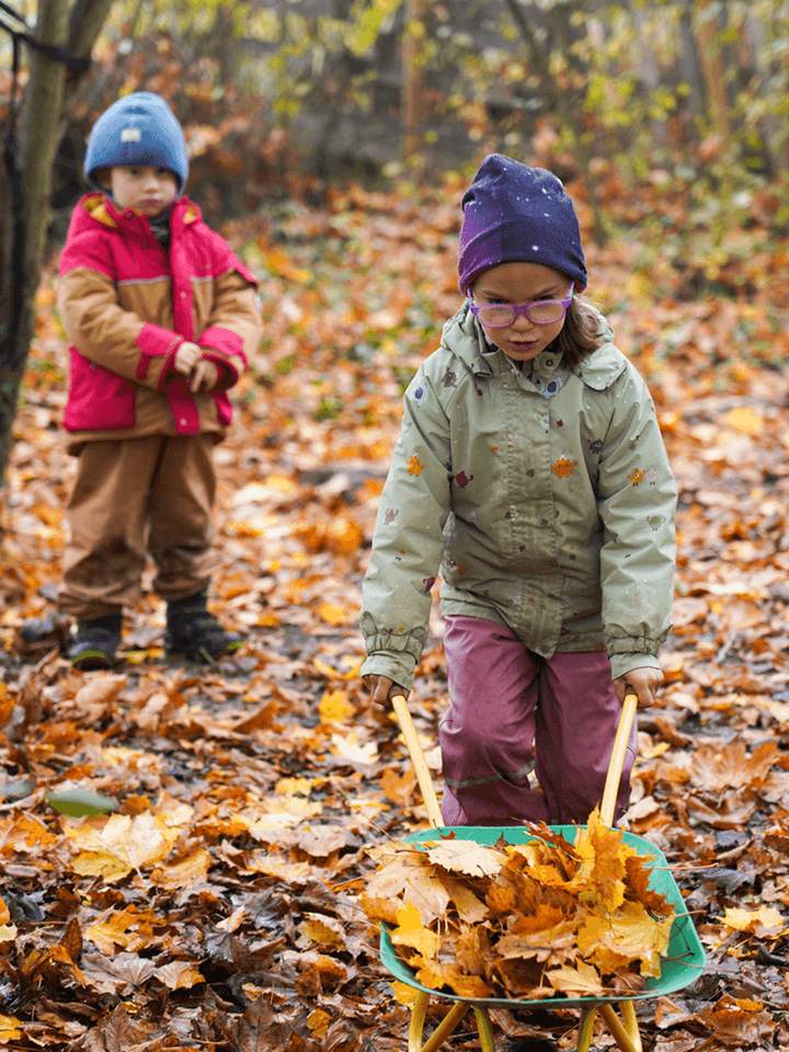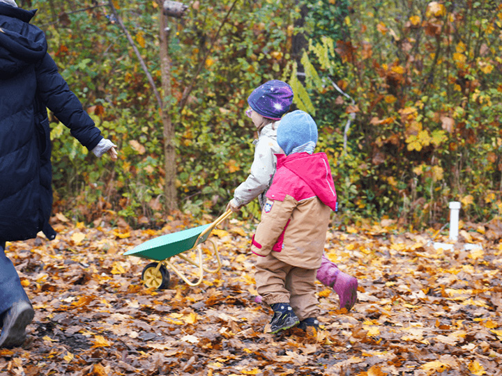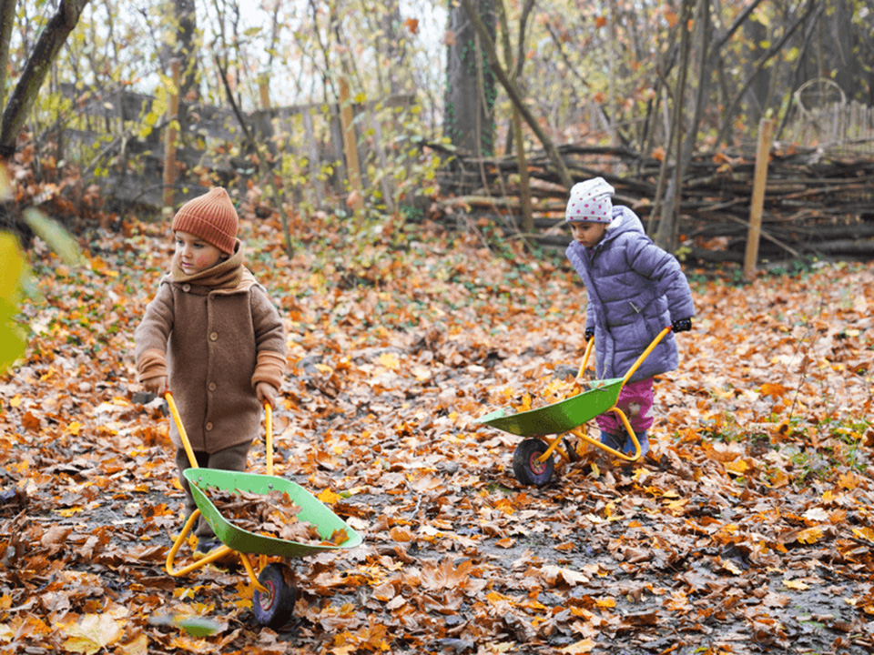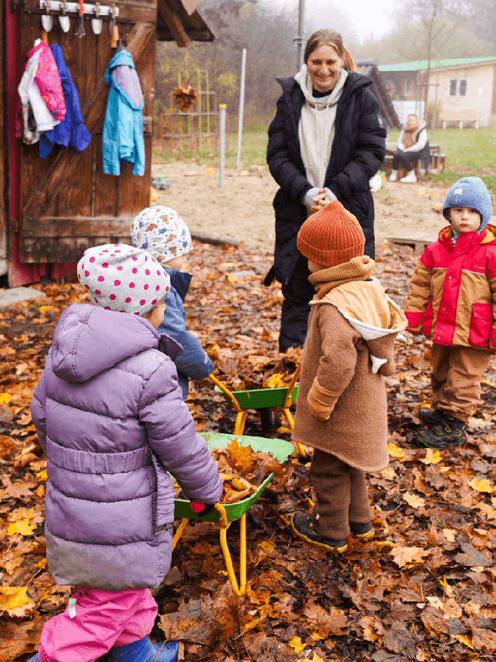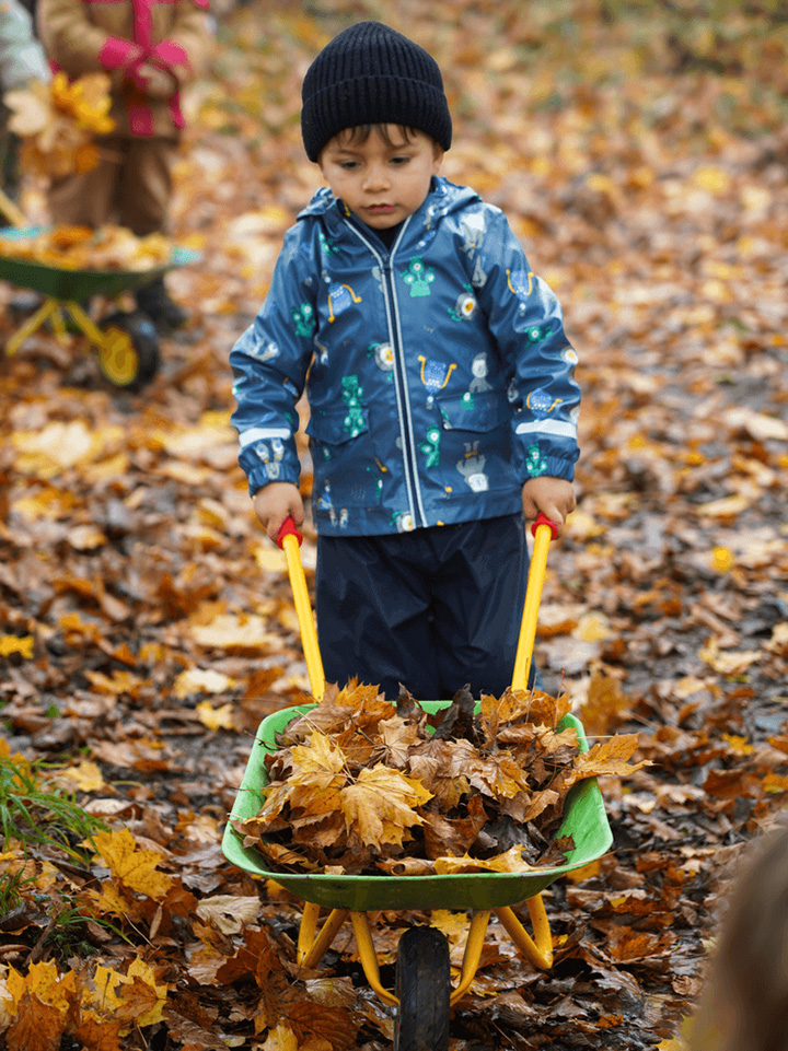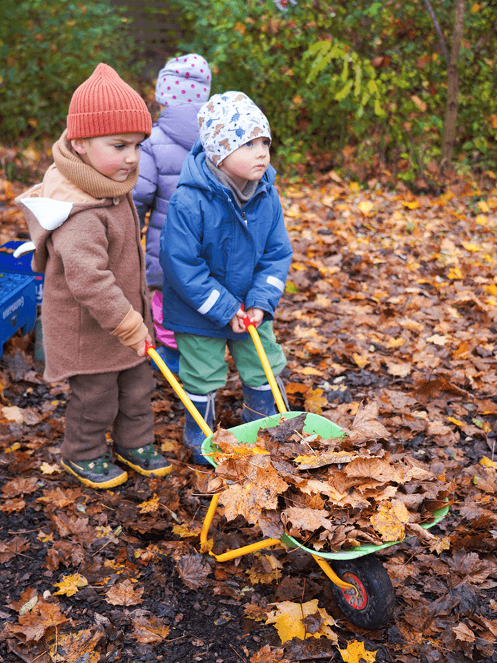 Der Herbst mit seinen bunten Blättern bietet uns viele wunderbare Spielmöglichkeiten. Gemeinsam liefen wir über raschelnde Blätter, hörten ihr Knistern unter unseren Füßen und genossen das herbstliche Gefühl. Mit Rechen sammelten wir die Blätter ein und transportierten sie mit der Schubkarre zu einem großen Haufen. Dort entstand ein gemütliches Blätterversteck – vielleicht als Winterquartier für einen Igel.