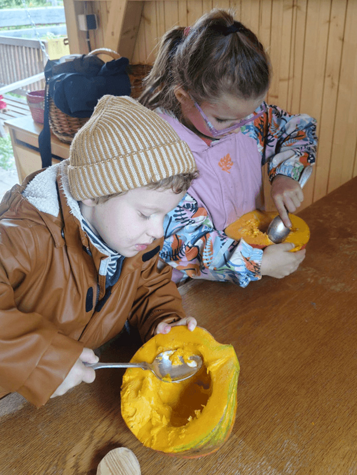 Bei uns gab es leckere Kürbiswaffeln! Die Kinder halfen fleißig beim Ernten, Schnibbeln und Backen. Besonders stolz waren wir darauf, dass die Kürbisse selbst angepflanzt und großgezogen wurden.