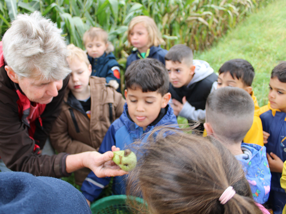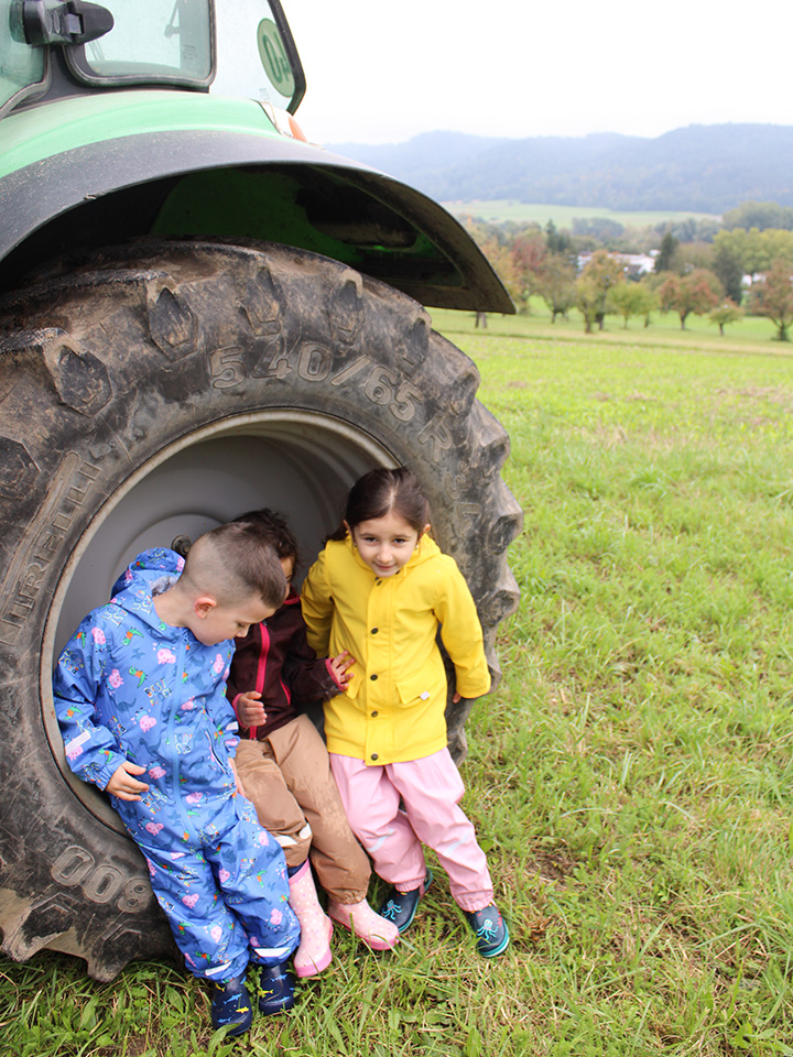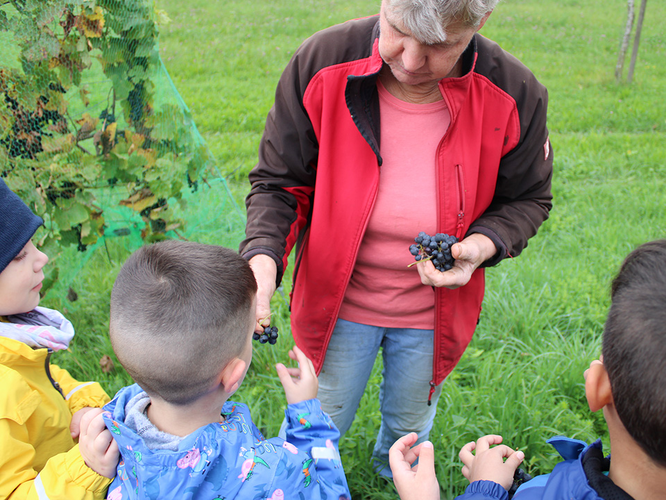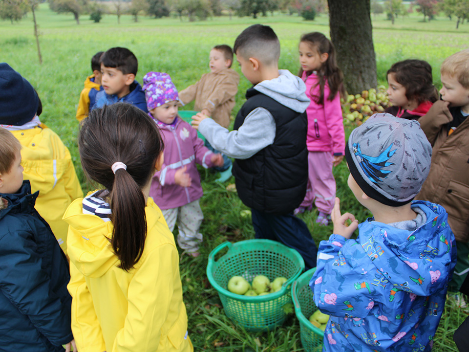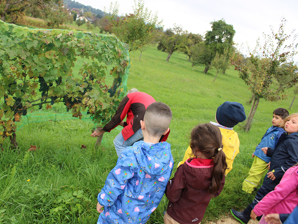 Anschließend sammelten wir die Äpfel in Körbe – und natürlich wurde auch probiert: saftig, süß und richtig lecker! Auf der Streuobstwiese entdeckten wir außerdem Birn- und Nussbäume. Mit großer Freude sammelten die Kinder Birnen und Nüsse. Ein besonderes Highlight war der Besuch beim Nachbarn, bei dem wir sogar frische Trauben naschen durften.