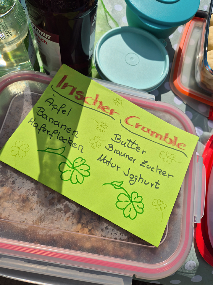 Das Sommerfest wurde durch diese kleine Darbietung eröffnet – und dann ging es auch schon an das bunte Buffet mit internationalen Köstlichkeiten. Auf dem großen Buffettisch fanden sich Speisen aus verschiedenen Ländern: Von Hummus mit Fladenbrot aus Jordanien über französischen Flammkuchen, italienische Pizzaschnecken bis hin zu einem irischen Apple Crumble – für jeden Geschmack war etwas dabei.