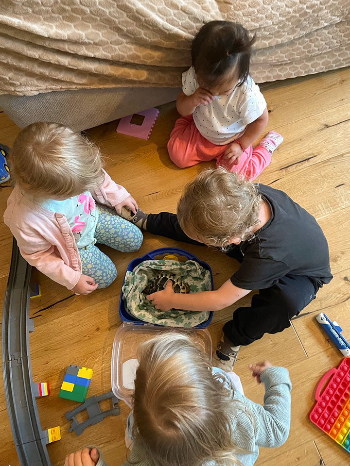 Wir haben einen großen, hellen Spielbereich mit angrenzender Küche und Essbereich, einen separaten Schlafraum/Turnraum, einen großen Wickelbereich mit Kindertoiletten, eine Kindergarderobe und ein Personalzimmer. Außerdem grenzt direkt an unseren Eingang ein Außenbereich mit Sandkasten, Spielturm und eine Abstellhütte für unseren Kinderbus und Outdoorspielzeuge.