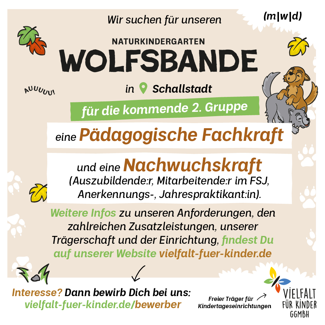 Du interessierst Dich für unser Pädagogisches Profil, unsere Schwerpunkte der Kita und das Berufsbild? Dann klicke hier.