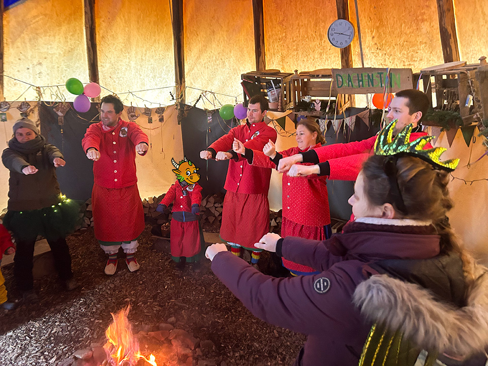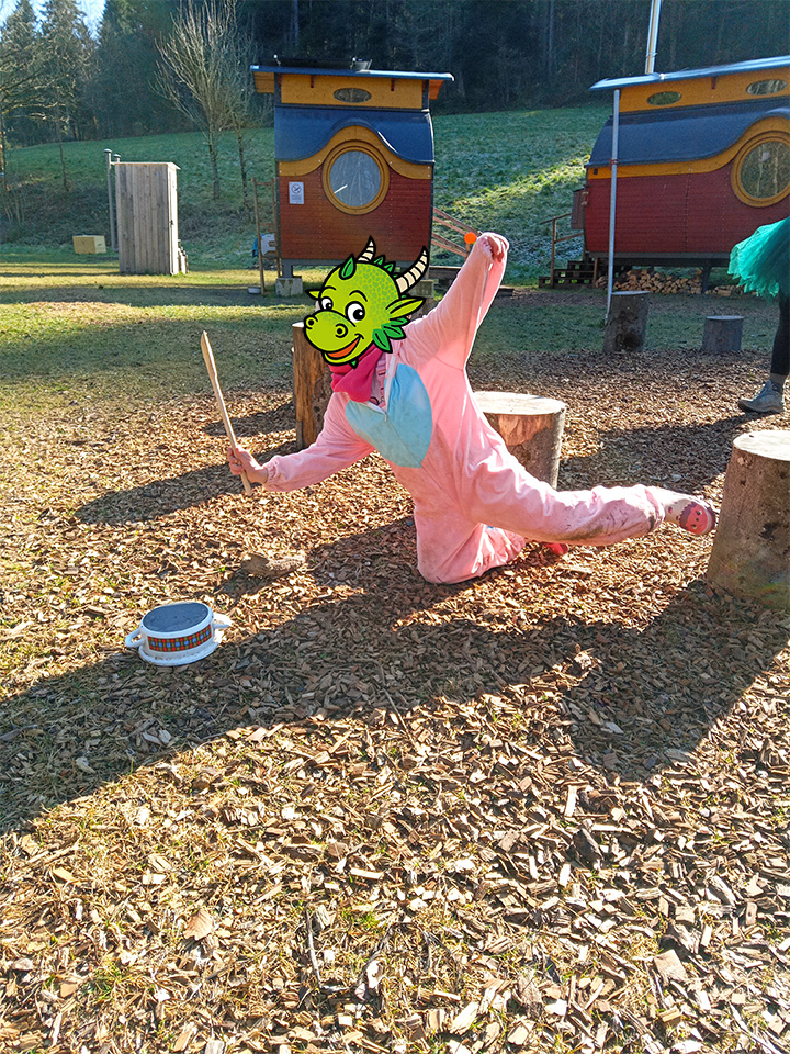 Am schmutzigen Donnerstag begann dann auch im Drachenstein die wilde Fasnachtszeit. Wir starteten traditionell im Schlafanzug (Hemdklunger) und mit lauter Musik. Am Morgen konnten die Kinder sich schminken lassen und nachdem der Regen dann nachgelassen hat, machten wir uns mit den selbst gebastelten Instrumenten auf den Weg ins Dorf, um den Anwohnern zu zeigen, dass auch die Drachensteiner in Fasnachtsstimmung sind. Es wurde viel getanzt und laut gesungen.