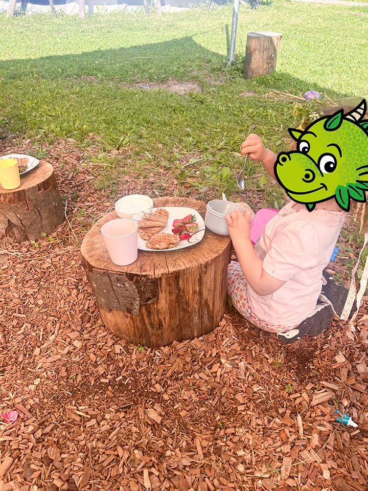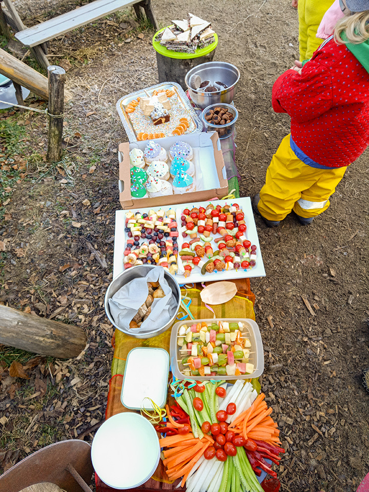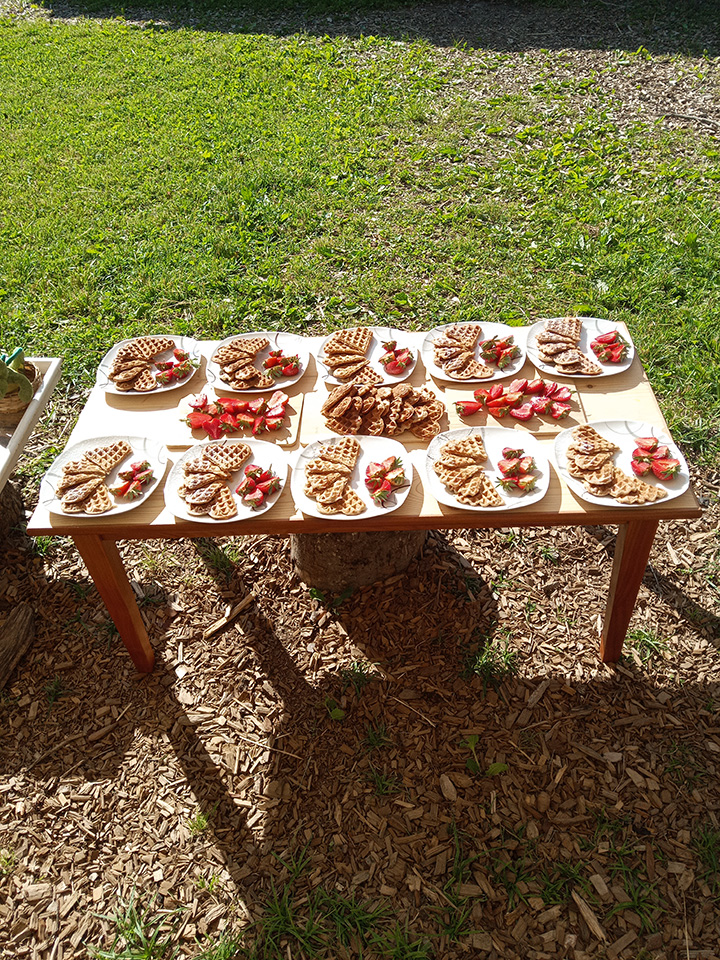 Am Freitag war es dann soweit. Mit einer Geschichte von Pettersson und Findus starteten wir im Morgenkreis in unser Fest. Auch ein kleines Feuer haben wir angezündet – denn das gehört einfach dazu. Zum Frühstück gab es dann Waffeln mit frischen Erdbeeren uns selbstgemachte Holunderlimonade. Der ganze Tag wurde mit fröhlicher Musik untermalt und auch das Tanzen kam nicht zu kurz.