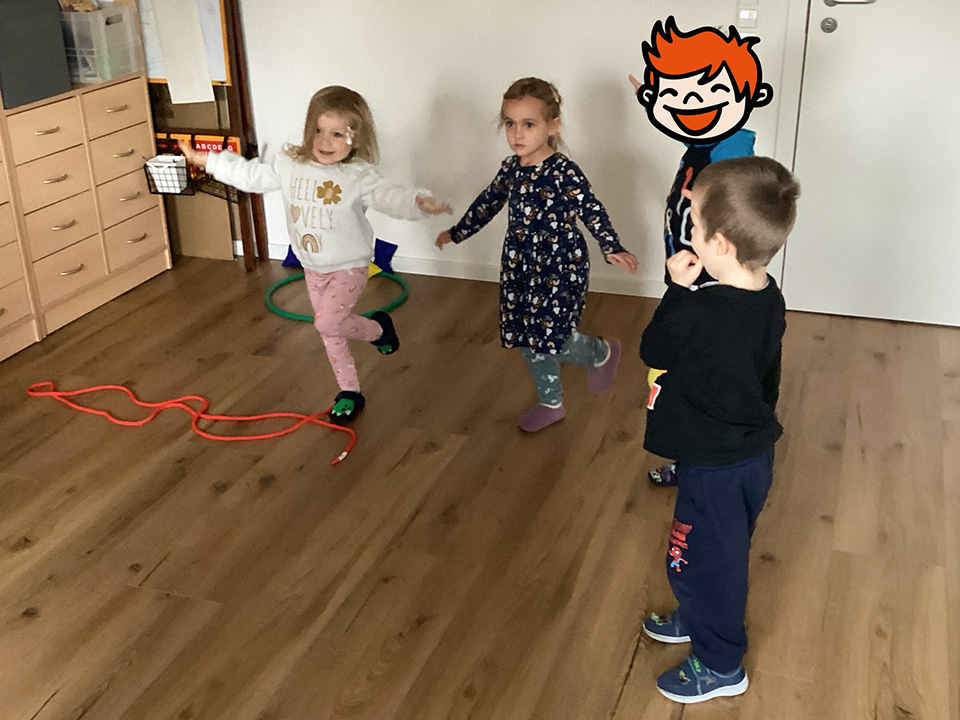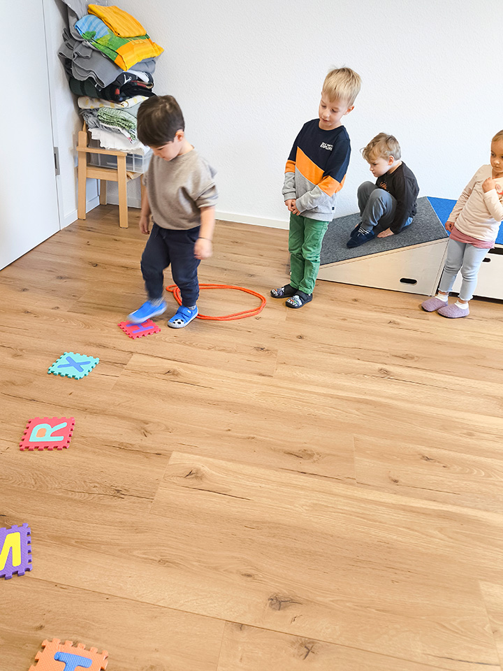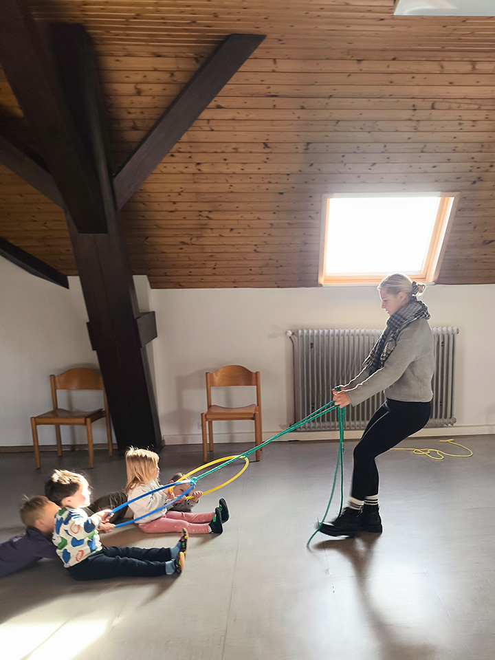 Unsere Schlossstunde wurde ins Leben gerufen: Bewegungsstunden, in denen wir spielerisch Bewegung und Sport entdecken – inspiriert von verschiedenen Tieren. Das Känguru zeigt uns, wie man gut springt. Der Bär liebt Yoga. Der Kletteraffe hangelt sich geschickt hin und her. Viele Tiere und ihre einzelnen Bewegungsabläufe bauen aufeinander auf und fördern die Körperwahrnehmung und Koordination der Kinder. Die Schlossstunden finden in unserem Bewegungsraum, draußen und sogar im alten Feuerwehrhaus statt, wo uns ein größerer Raum zur Verfügung steht.