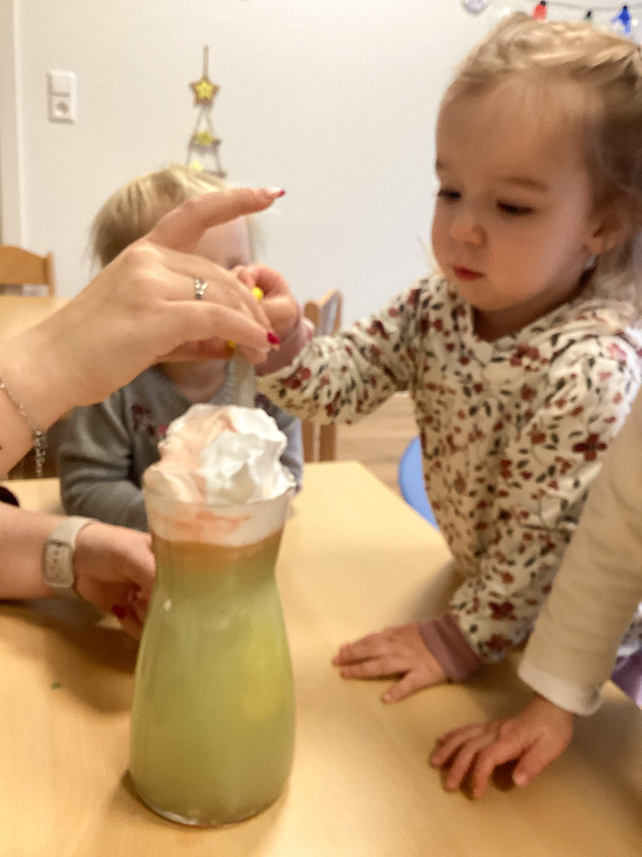 Neben Bewegung wurde auch fleißig experimentiert: Wasser- und Farbeexperimente, eine glühende Mandarine und ein blubbernder Vulkan, Experimente zur Wahrnehmung unserer Körperstellen.