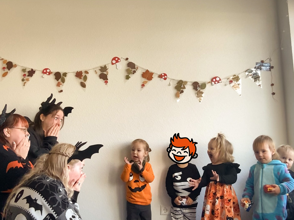 Ein selbstgemachtes Sensomotorik-Brett wurde gemeinsam hergestellt, unterstützt von den Eltern. Es wurde auch richtig gruselig bei uns: An Halloween befreiten die Fledermäuse aus der Burg, die von den Schlossdrachen bewacht wurden, und wir feierten ein Halloweenfest mit großem Buffet.