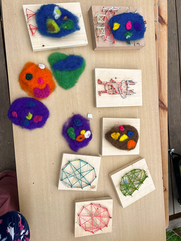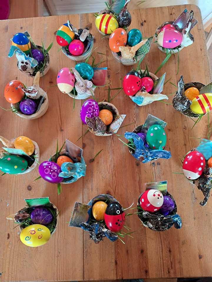 Natürlich stand auch das handwerkliche Tun im Mittelpunkt: Mit Holz, Nägeln, Wolle und Farbe entstanden fantasievolle Osterhasen, Ostereier und bunte Osterhühner. Aus Filz wurden einzigartige Ostereier gestaltet – jedes ganz individuell und mit viel Liebe zum Detail.