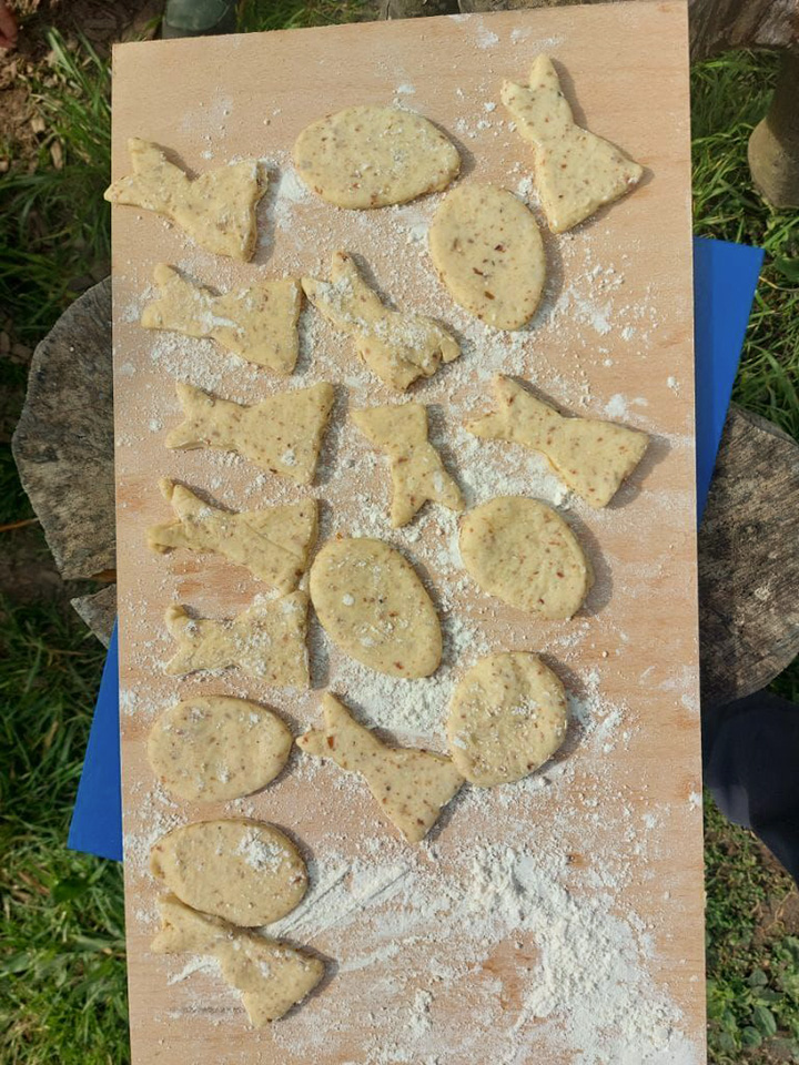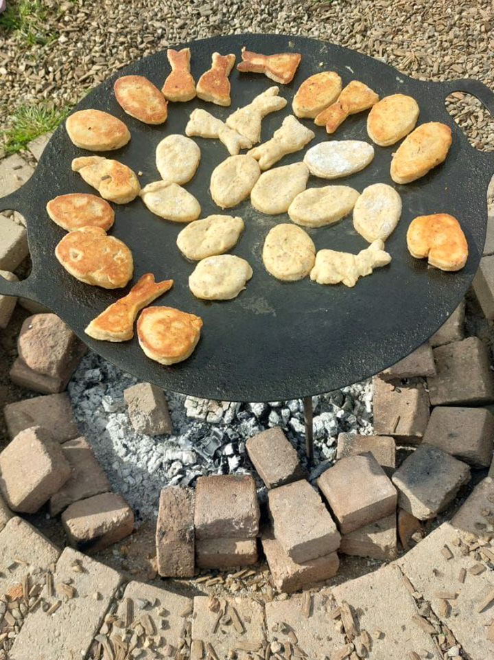 Zum Abschluss der Osterwoche wurde es noch einmal lecker: Gemeinsam bereiteten die Kinder einen Quark-Öl-Teig zu, aus dem kleine Osterhasen und Ostereier geformt wurden. Über dem Feuer in einer großen Pfanne ausgebacken, duftete es bald herrlich nach frisch Gebackenem – ein köstlicher Nachtisch, der allen besonders gut geschmeckt hat.