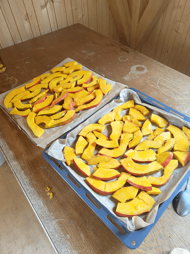 Bei uns gab es leckere Kürbiswaffeln! Die Kinder halfen fleißig beim Ernten, Schnibbeln und Backen. Besonders stolz waren wir darauf, dass die Kürbisse selbst angepflanzt und großgezogen wurden.