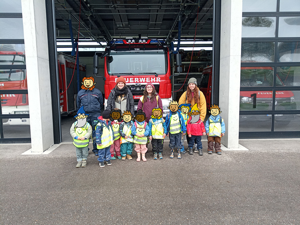 Startpunkt des Ausflugs war der Abenteuerspielplatz. Von dort aus begab sich die 13-köpfige Truppe nach einer gemütlichen Frühstückspause zu der Feuerwache. Die Kinder waren ganz aufgeregt und freuten sich. An der Wache angekommen, begrüßte uns Wolfgang Schilli, der 2. stellvertretende Kommandant und Karen-Elisa Wörter, herzlich willkommen.