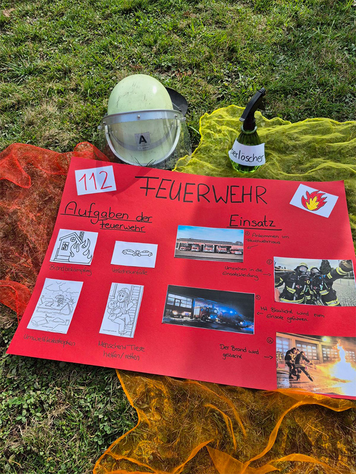 Die beiden erklärten den Kindern, dass es auch eine Jugendfeuerwehr und eine Kinderfeuerwehr gibt. Als letztes machten wir noch einen Feuerwehr Tanz. Nach einer kurzen Spielpause im Raum der Jugendfeuerwehr, machte sich die Truppe auf, um den erlebnisreichen Tag auf dem Spielplatz ausklingen zu lassen.