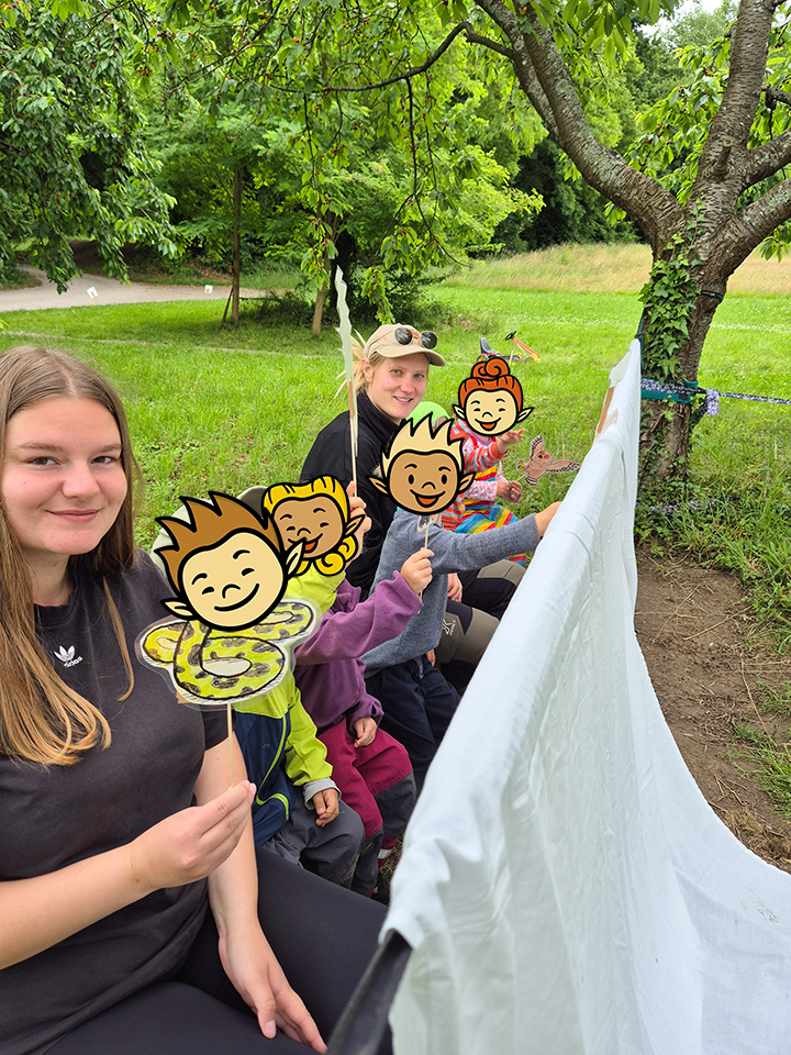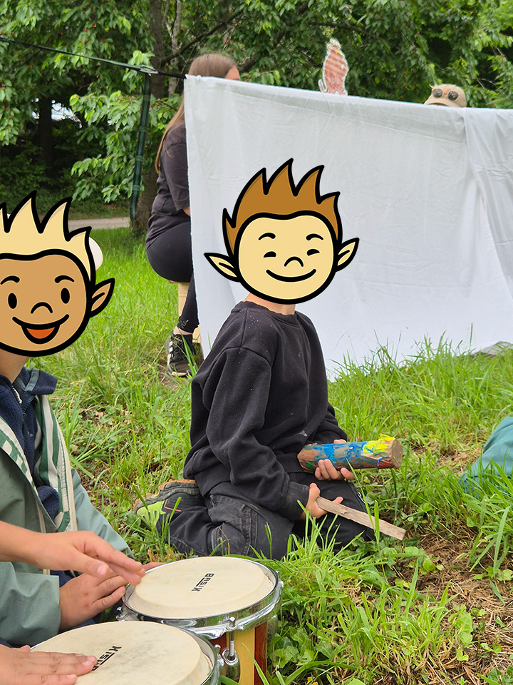 Die Figuren wurden von den Kindern bunt ausgemalt, an Stäbe geklebt und zum Leben erweckt. Begleitet wurde das Stück von selbst gespielten Instrumenten, die die Geschichte klanglich untermalten und lebendig werden ließen. Die Kinder haben das Theaterstück mit großer Begeisterung und viel Ausdruckskraft präsentiert – ein echtes Erlebnis für alle Gäste.