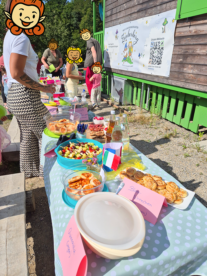 Am Donnerstag, den 17. Juli, wurde es bei strahlendem Sonnenschein feierlich im Wald- und Naturkindergarten Zauberberg: Wir luden alle Familien herzlich zu unserem internationalen Sommerfest ein. In den Tagen zuvor bereiteten wir gemeinsam mit den Kindern die Dekoration vor. Es entstanden bunte Wimpelketten mit Flaggen verschiedenster Länder.