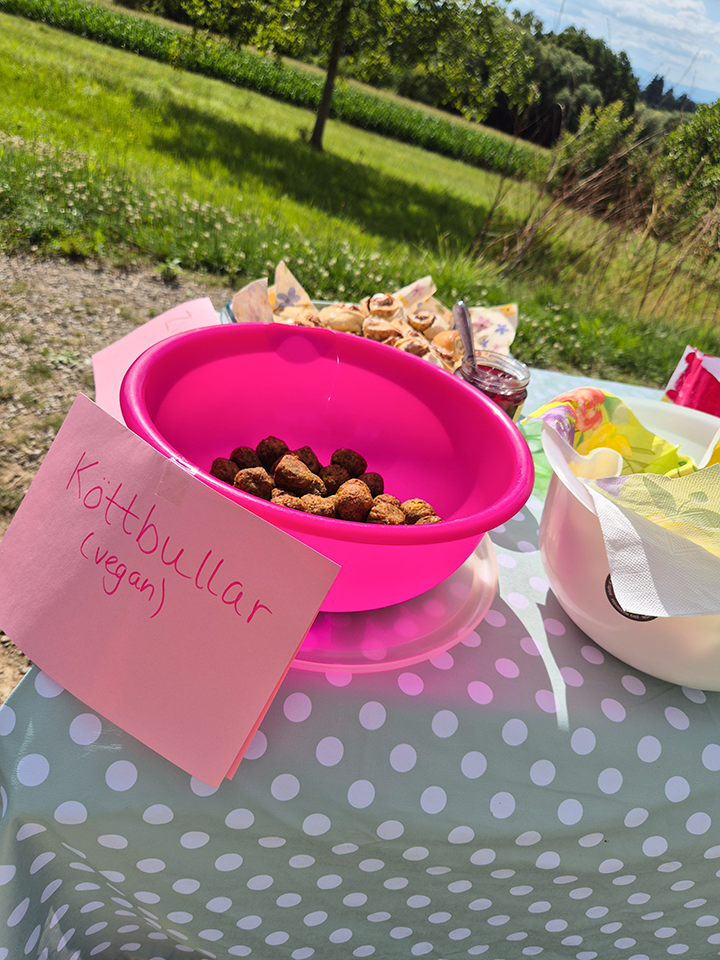 Das Sommerfest wurde durch diese kleine Darbietung eröffnet – und dann ging es auch schon an das bunte Buffet mit internationalen Köstlichkeiten. Auf dem großen Buffettisch fanden sich Speisen aus verschiedenen Ländern: Von Hummus mit Fladenbrot aus Jordanien über französischen Flammkuchen, italienische Pizzaschnecken bis hin zu einem irischen Apple Crumble – für jeden Geschmack war etwas dabei.