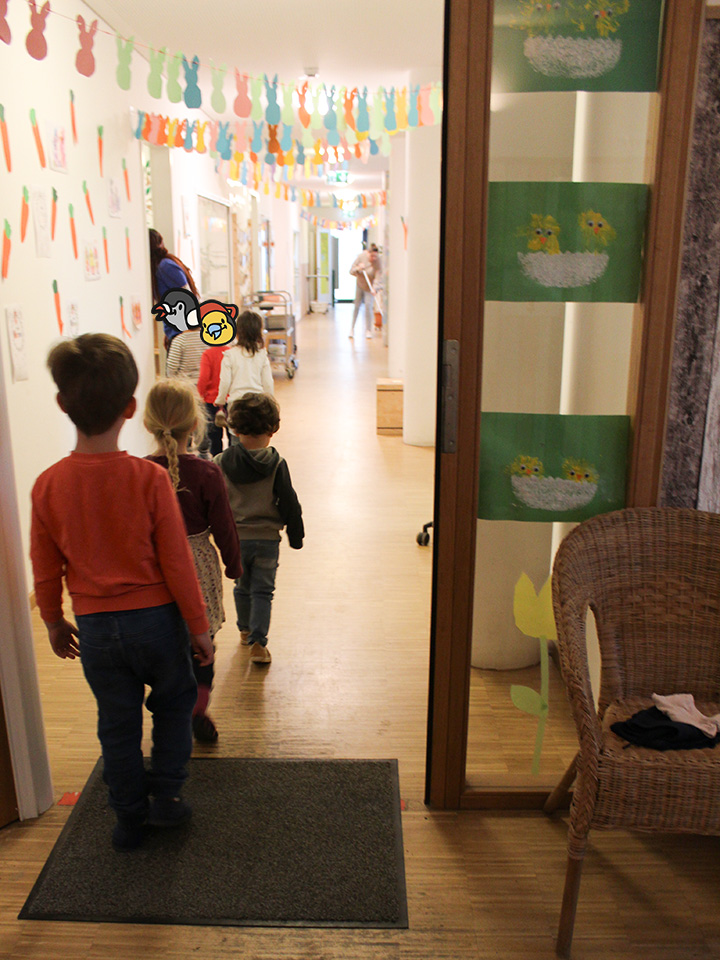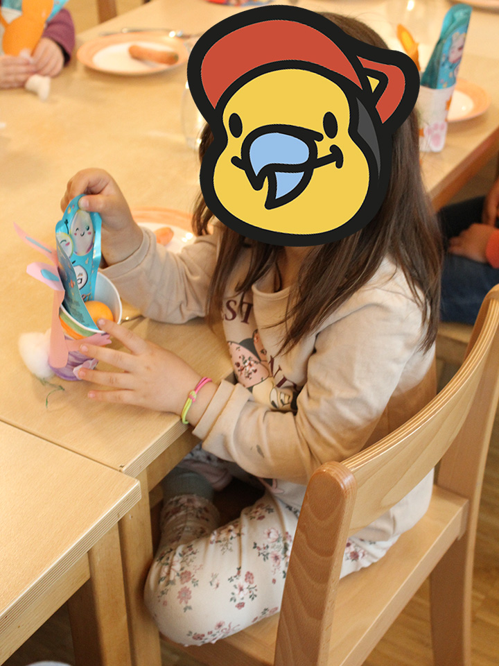 Aber warum all diese fröhlichen Vorbereitungen? Ah, genau! Heute war der Osterhase zu Besuch! Der Tag begann mit einem leckeren Frühstücksbuffet, und danach ging es voller Vorfreude in den Turnraum, um Lieder zu singen. Doch plötzlich huschte etwas vor der Fensterscheibe vorbei – wer war das? Der Osterhase!!! Schnell liefen wir mit den Kindern zurück in den Kindergarten und entdeckten, dass der Hase viele Karotten verloren hatte. Eifrig machten sich die Kinder auf die Suche und fanden alle Karotten. Als Dankeschön hinterließ der Osterhase für jedes Kind ein wunderschönes, gefülltes Osterkörbchen.