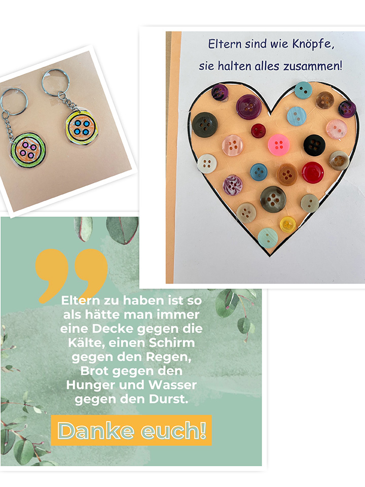 Mit viel Hingabe und Geduld haben die Kinder des Kinderhauses Zugvögel liebevolle Geschenke für ihre Eltern gestaltet. Es wurden kreative Karten gebastelt und mit Knöpfen verziert, ganz nach dem Motto: „Eltern sind wie Knöpfe, sie halten alles zusammen.“ Als besonderen Begleiter für den Alltag der Eltern fertigten die Kinder zudem einen einzigartigen Knopf an, der fortan den Schlüsselbund zu etwas ganz Besonderem machen wird.